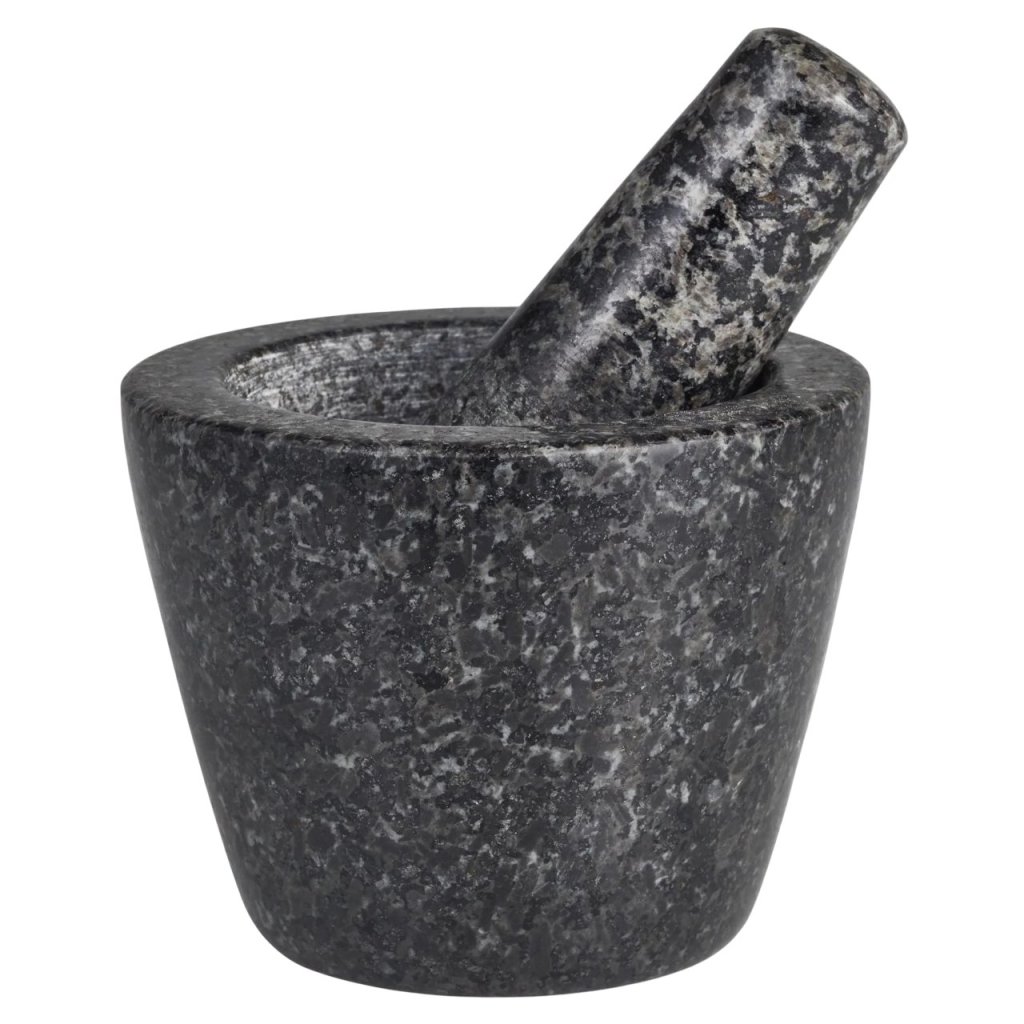 - der Mörser eignet sich für die Zubereitung von frischen Gewürzen, Pesto, Knoblauchpaste, Guacamole, Hummus oder selbstgemachter Salsa-Sauce