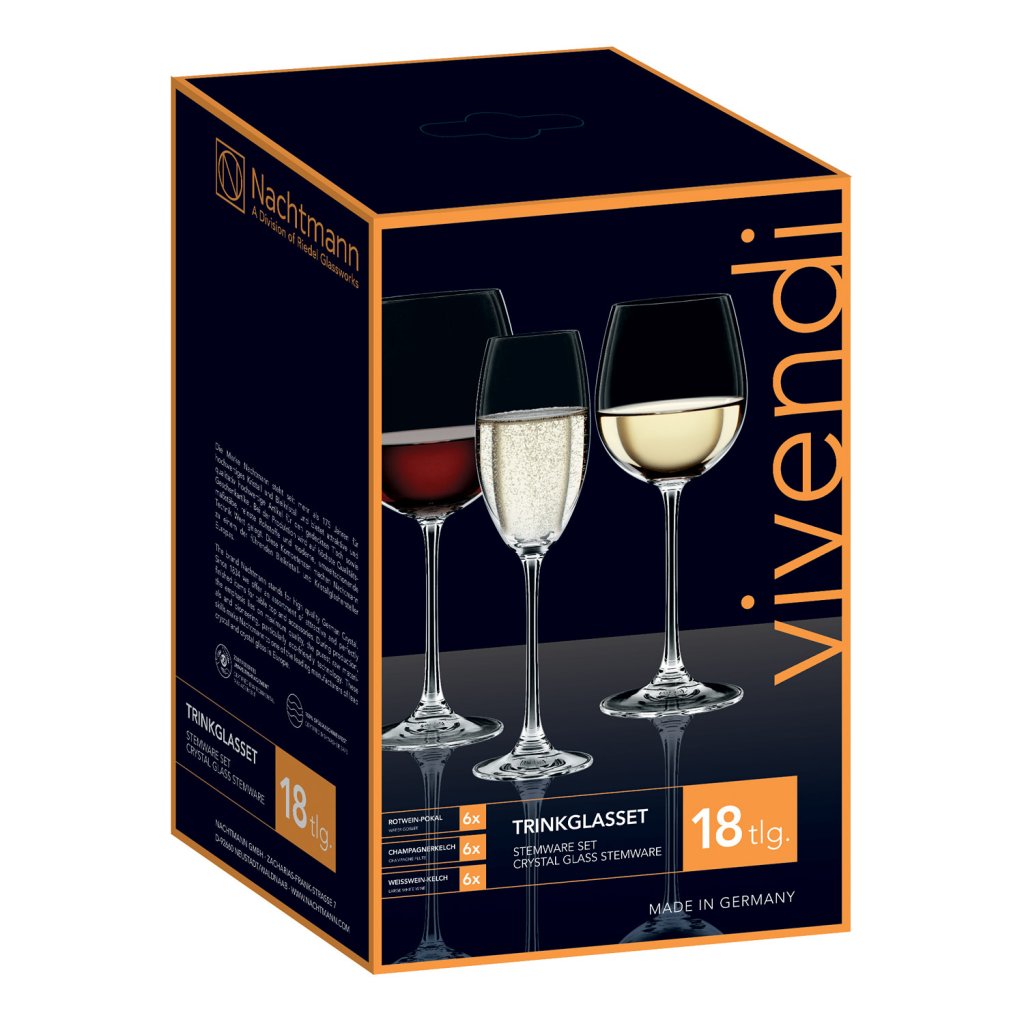 Die praktische Packung mit 18 Weingläsern (6 Stück für Rotwein, 6 Stück für Sektflöte, 6 Stück für Weißweinkelch) aus der Vivendi Premium-Kollektion des deutschen Herstellers Nachtmann ist ein unverzichtbarer Grundstein für die Ausstattung einer Hausbar oder eines Weinkellers. Langlebigkeit und Funktionalität in glänzender Kristalloptik für Ihre Lieblingsgetränke, vom Toast bis zum Digestif.
