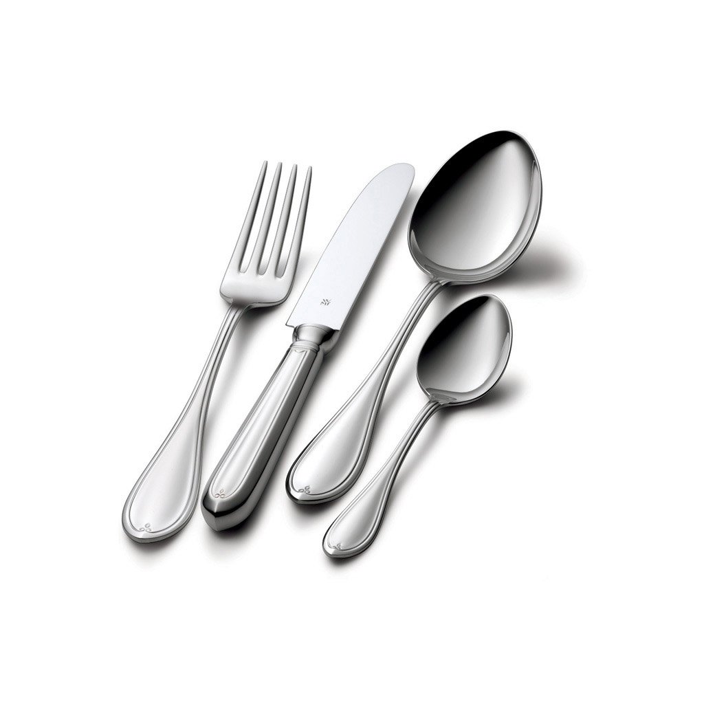 Das winzige Blattmotiv WMF des Premiere Bestecks ist meisterhaft ausgearbeitet und wiederholt sich auf der Rückseite. Der achteckige Griff des Messers und die aufwändige Verzierung zeigen die hohe Verarbeitungsqualität dieses Bestecks.