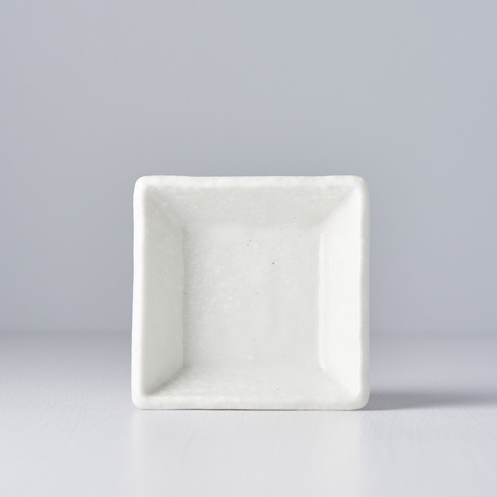 Die Schale hat eine quadratische Form und ist weiß und matt lackiert. Er ist ideal zum Servieren von Saucen, Dips oder Salsas.