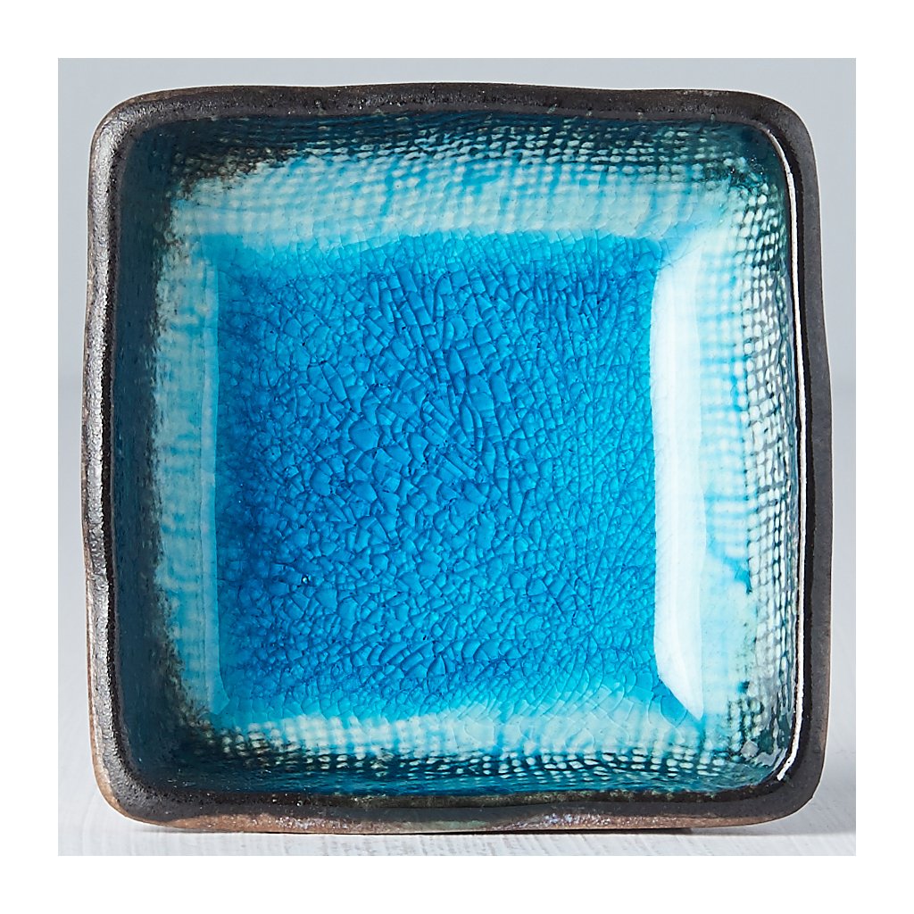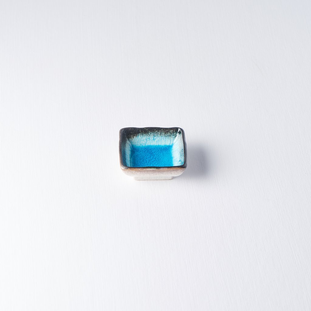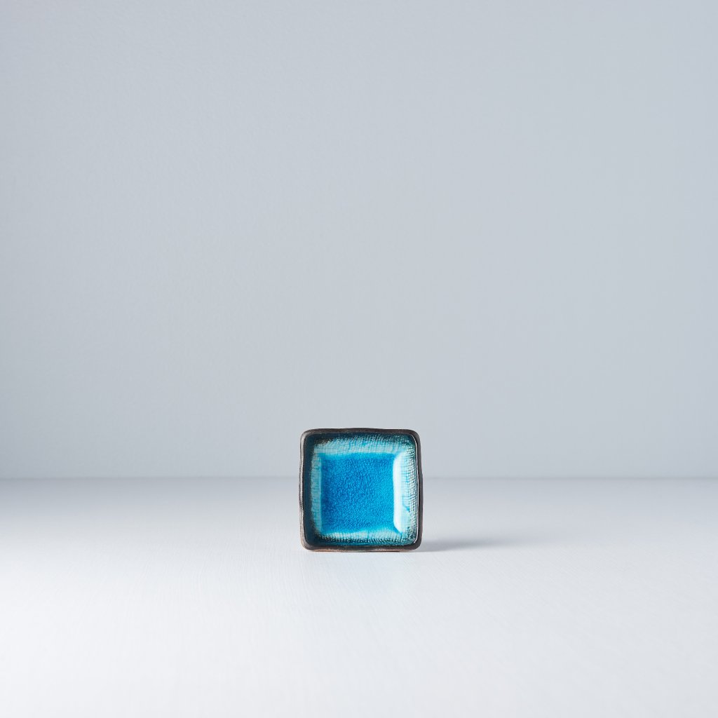 Diekleine quadratische Schale aus der Sky Blue Kollektion von MIJ ist handgefertigt aus langlebiger Naturkeramik, die keine schädlichen Verunreinigungen oder Schwermetalle enthält. Es wird von japanischen Meistern hergestellt, deren Tradition bis ins 12. Jahrhundert zurückreicht. Die Farben sind von hoher Qualität, blättern nicht ab und enthalten auch keine schädlichen Stoffe.
