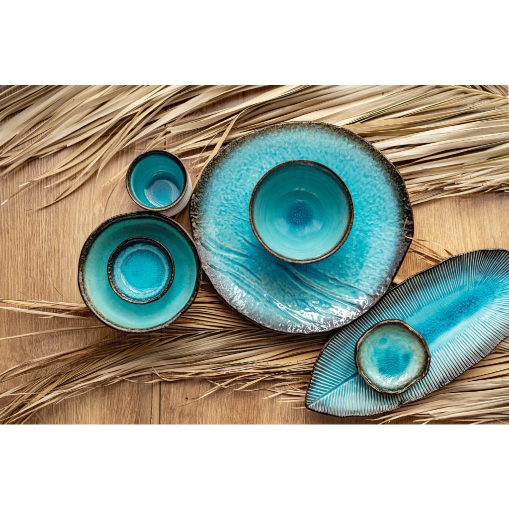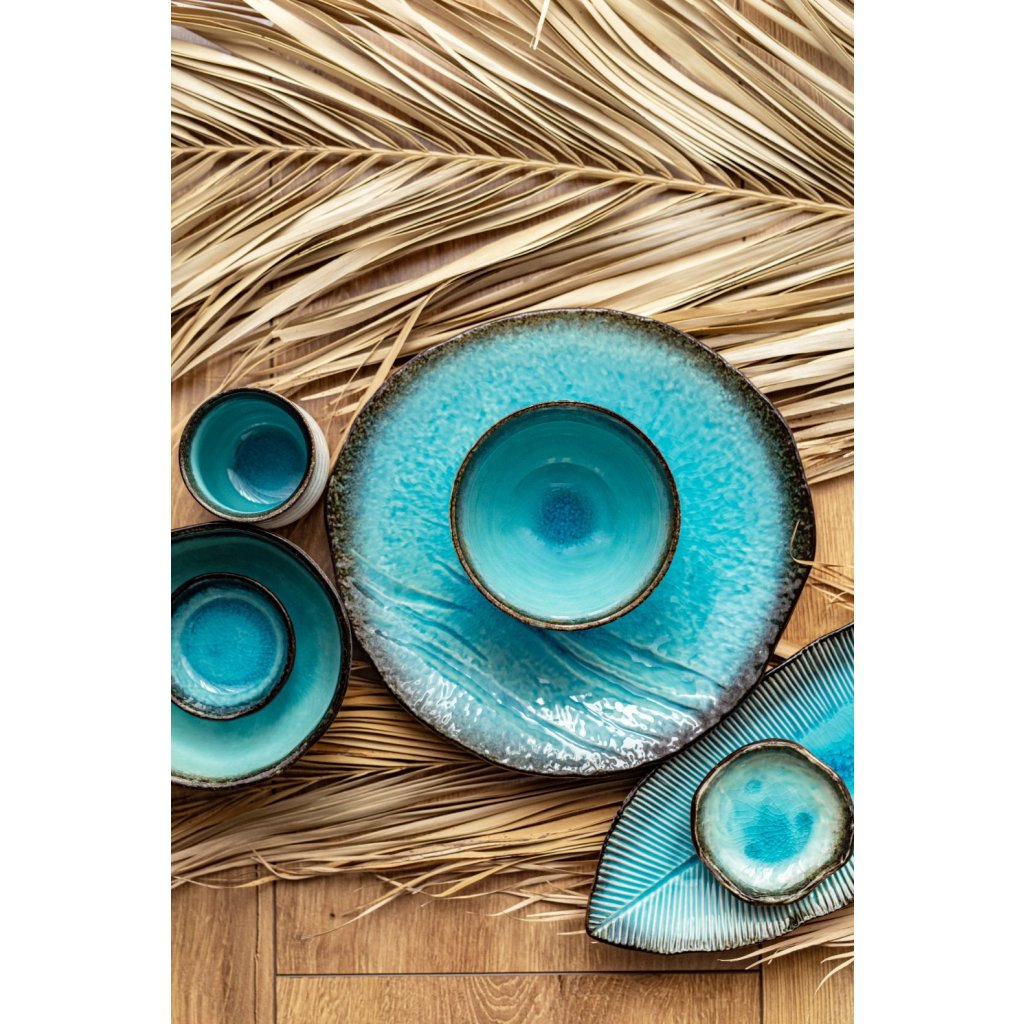 Die Gerichte der Kollektion Sky Blue entführen Sie ans Meer. Seine tief türkisfarbene Farbe erinnert an das klare Meer und sein brauner Rand an die Küste. Das Geschirr dieser Kollektion hat eine glänzende Oberfläche mit einer Craquelé-Glasur. Der unregelmäßige Rand deutet auf Handarbeit hin.