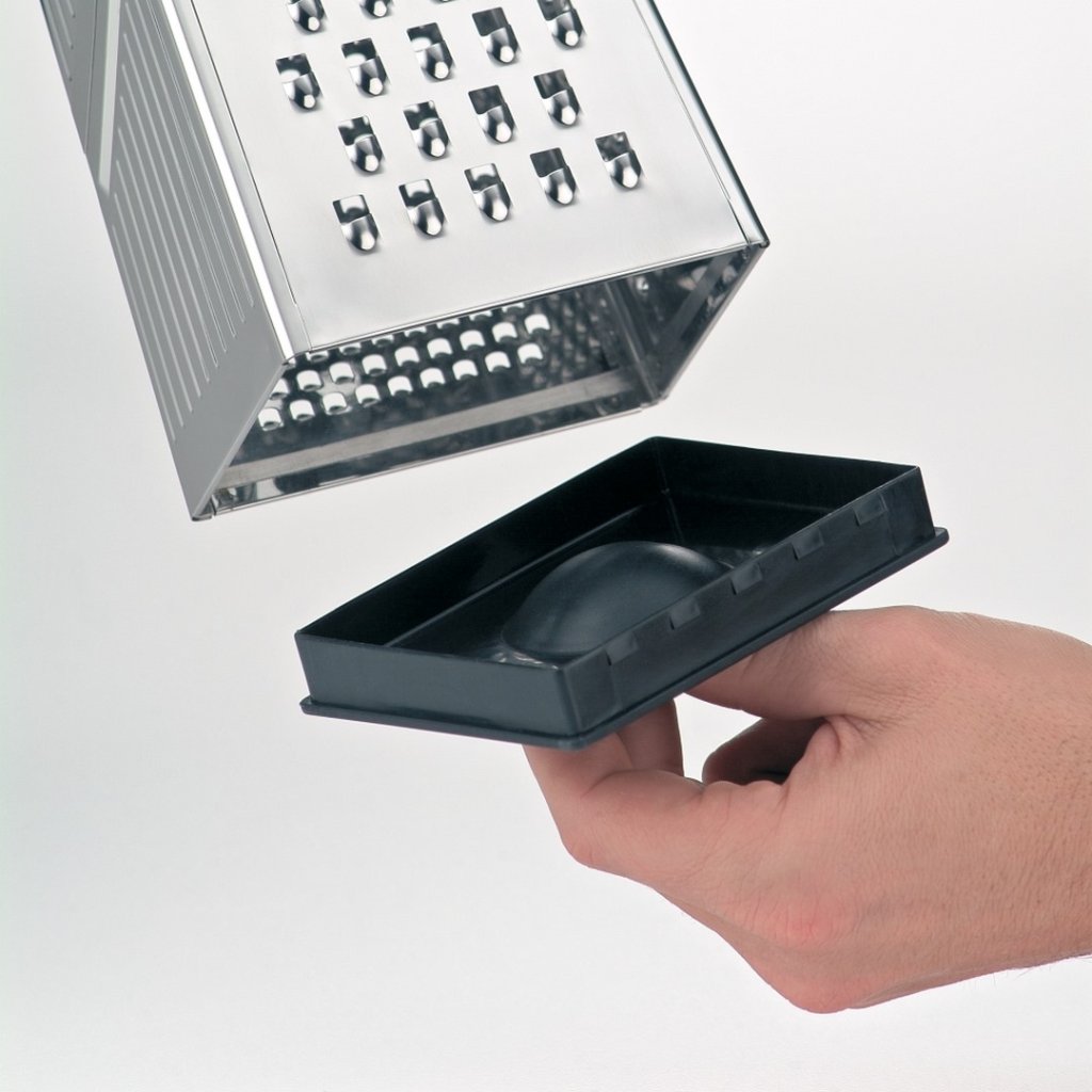 - Abnehmbarer Kunststoffboden - für geriebene Zutaten, die in das Innere der Reibe fallen