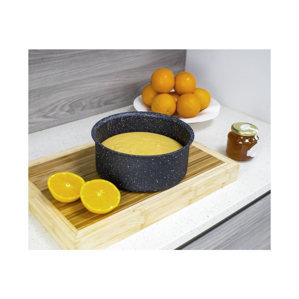 Die runde Backform ist aus hochfestem gehärtetem Aluminium mit einer Antihaft-Oberfläche und hoher Kratzfestigkeitgefertigt.