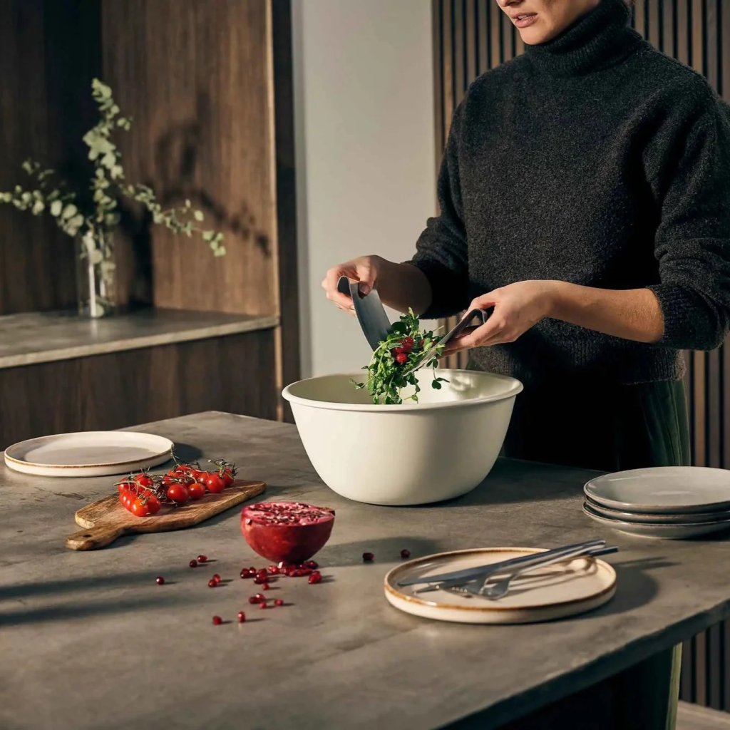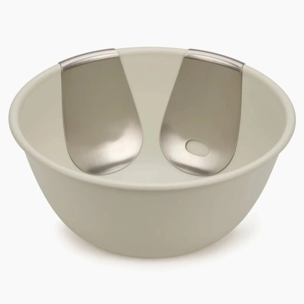- platzsparende Servierutensilien aus Edelstahl werden am Rand der Schüssel platziert