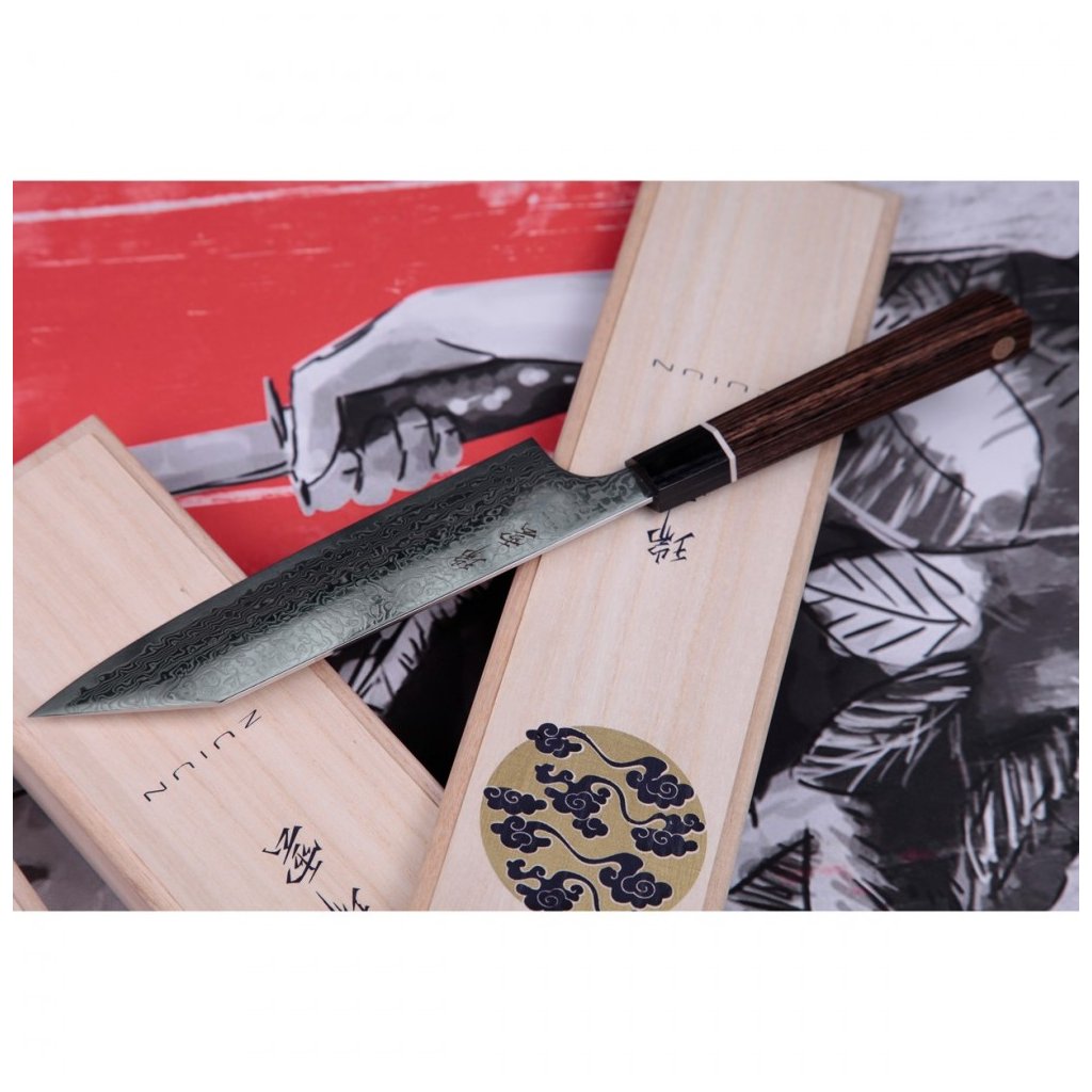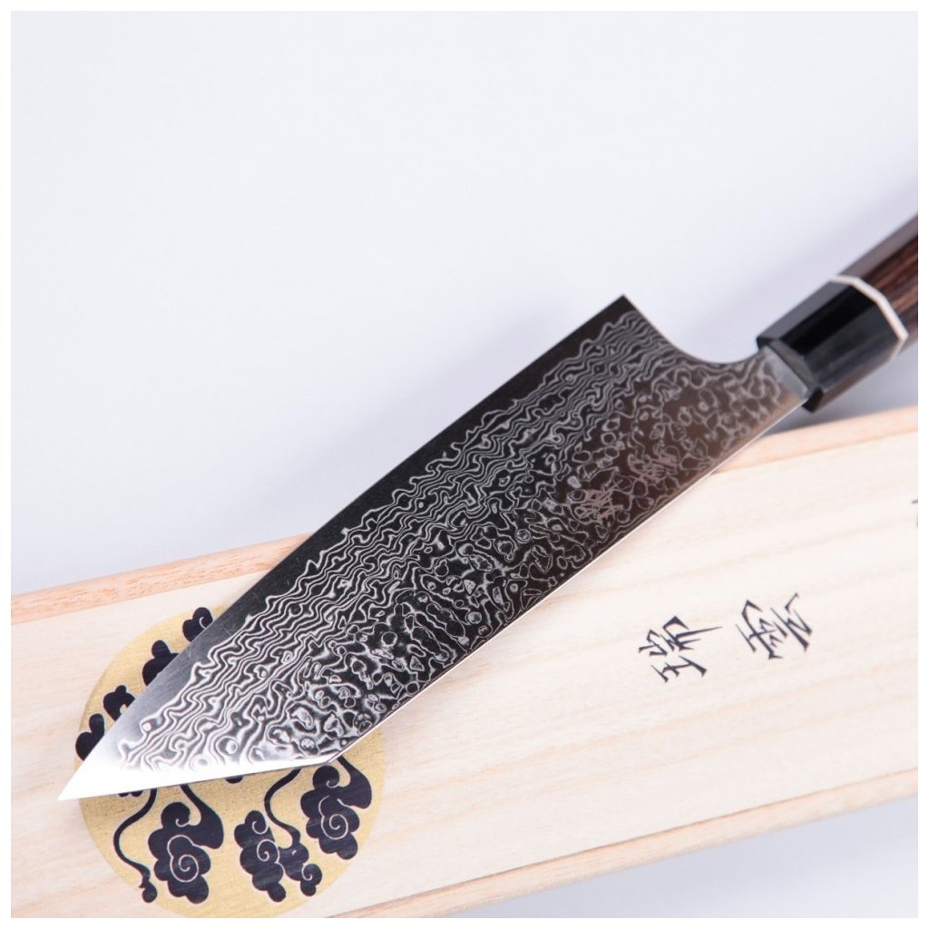 Da die Spitze der Klinge einem japanischen Schwert nachempfunden ist, eignet sie sich auch für die Zubereitung von Gerichten, die den Einsatz der Spitze erfordern, sowie für dekorative Schnitzarbeiten. Die lange Klinge und der japanische 7-Kant-Griff geben Ihnen die beste Kontrolle beim Schneiden und Zerteilen. Japanische Handwerkskunst, Präzision und neue Technologien machen dieses Damaszenerstahlmesser einzigartig und unnachahmlich. Zuiun ist eine Sonderausgabe, die zur Feier des hundertjährigen Bestehens von Kanetsugu produziert wurde.