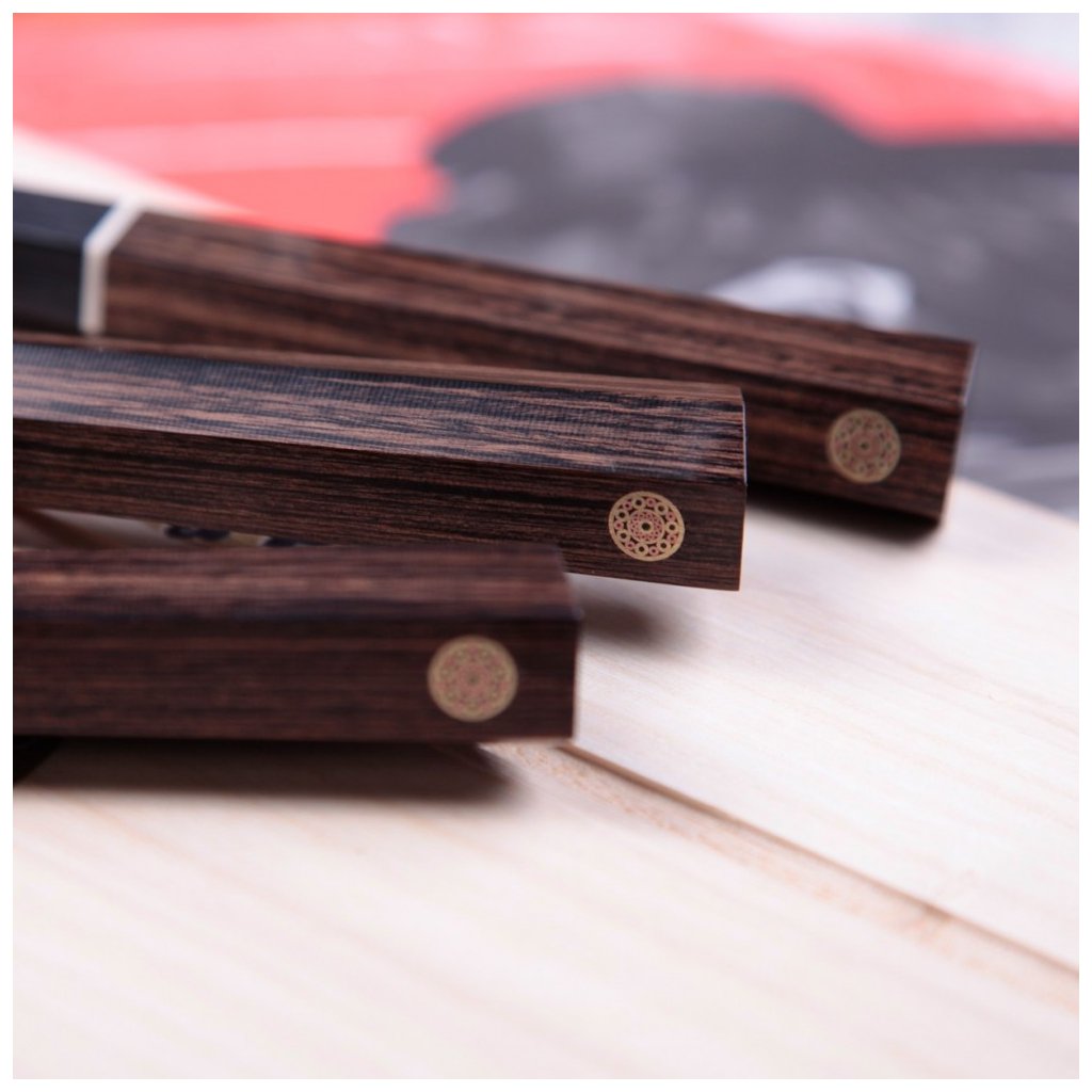 Der 7-schneidige Griff im japanischen Stil bietet perfekte Schneidkontrolle und effektiven Halt beim Schneiden. Ebenholz-Pakkaholz ist aufgrund seiner starken Maserung von Natur aus dauerhaft und formstabil. Der dekorative Griffstift ist eine subtile asiatische Dekorationsmethode. Die perfekte Balance des Messers bringt Komfort und verhindert Ermüdung der Hand. Die Kanetsugu ZUIUN-Messer werden Ihren Wunsch nach einem Präzisionswerkzeug japanischer Herkunft voll und ganz erfüllen.