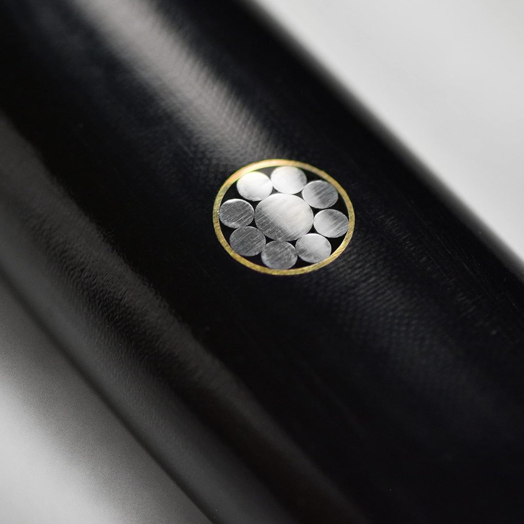 - der Griff ist mit zwei roten Ringen und dem traditionellen japanischen Samurai-Emblem an der Seite verziert