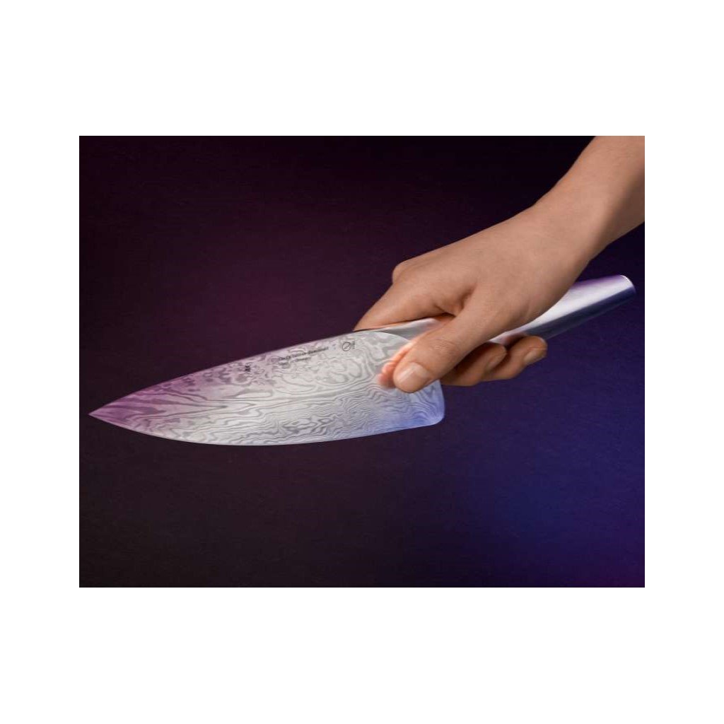 Chef's Edition Damasteel Messerset enthält Kochmesser , Fleischmesser und kleineres Gebrauchsmesser . Die Messer sind aus einem exklusiven Material Damasteel gefertigt - handgeschmiedetes Damasteel kombiniert mehrere Spezialstähle zu einer einzigen Stahlklinge, die aus 120 Schichtenbesteht. Das Ergebnis ist eine außergewöhnliche Haltbarkeit, dauerhafte Schärfe und eine säurebeständige Klinge aus rostfreiem Stahl.