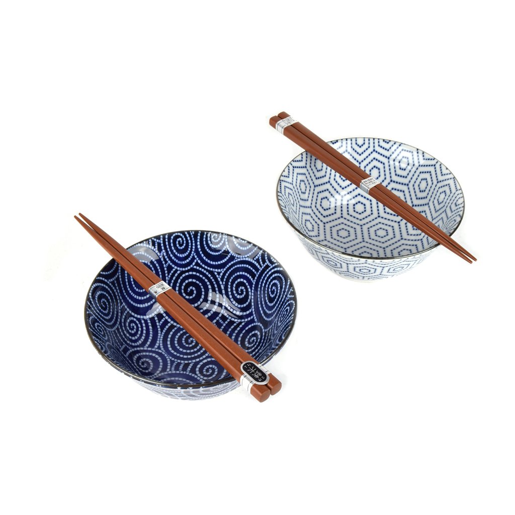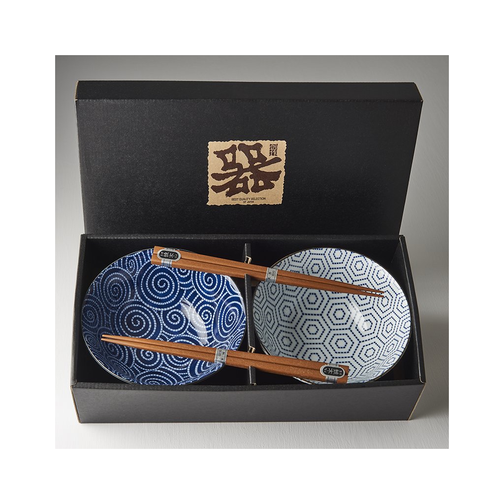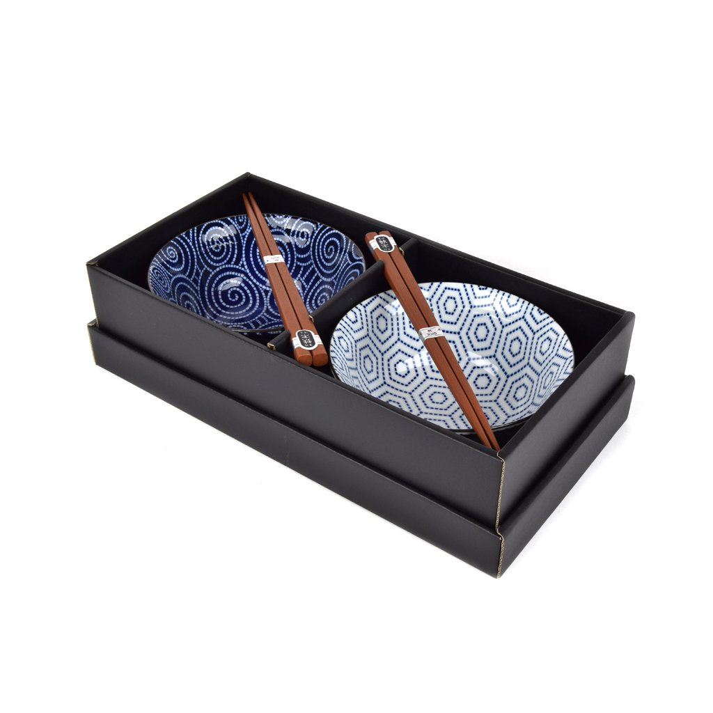 DasSet enthält 2 Paar Essstäbchen aus Holz und 2 Schalen mit geometrischen Mustern in Weiß bzw. Blau. Der Rand der Schalen ist in Gold eingefasst. Dieses Set wird in einer eleganten schwarzen Geschenkboxgeliefert und eignet sich daher auch als Geschenk für Freunde oder Geschäftspartner.