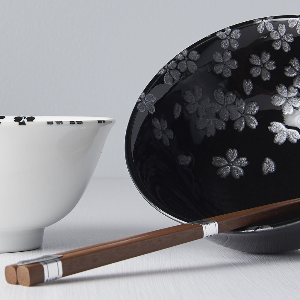 DasSet enthält 2 Paar Essstäbchen aus Holz und 2 Schalen in Schwarz und Weiß mit handgemalten grauen Skury-Blumen. Dieses Set wird in einer eleganten schwarzen Geschenkboxgeliefert und eignet sich daher auch als Geschenk für Freunde oder Geschäftspartner.