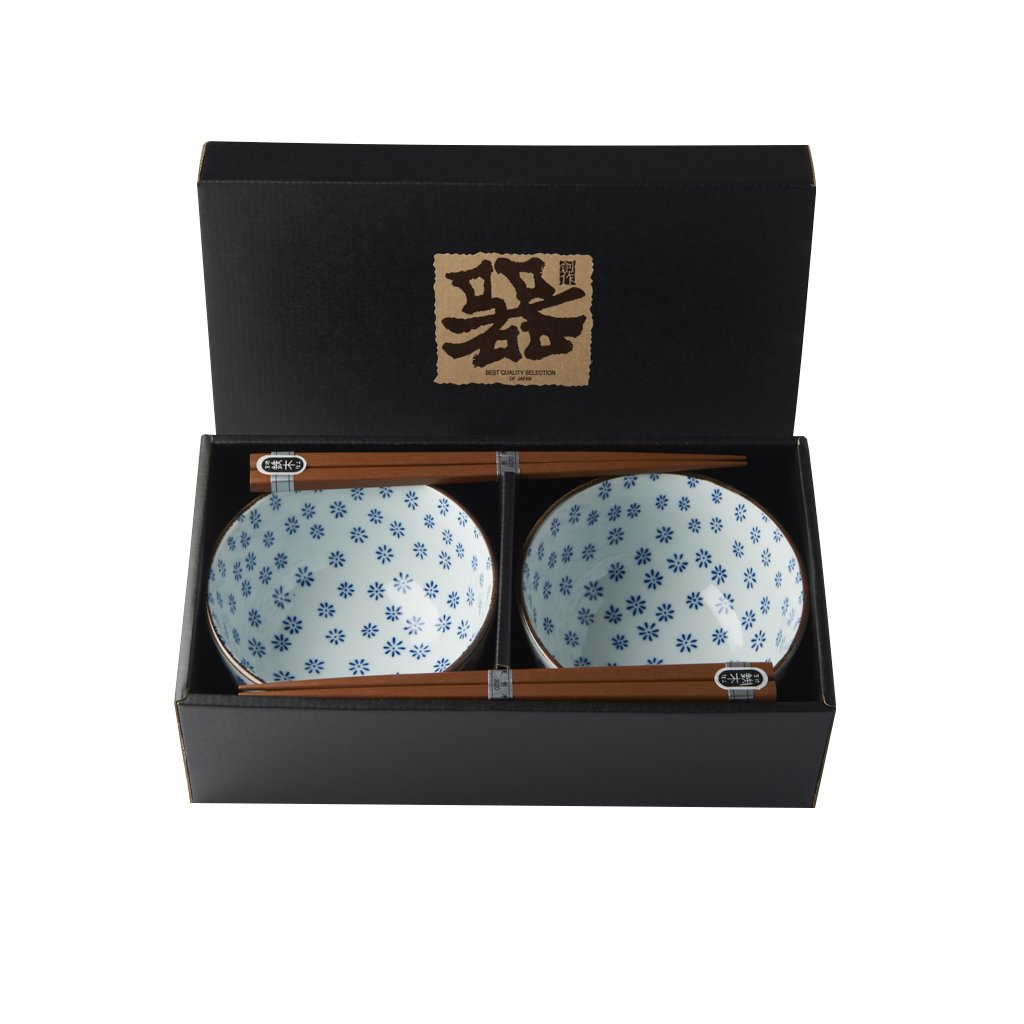 DasSet enthält 2 Paar Essstäbchen aus Holz und 2 Schalen in Weiß mit einem blauen Schneeflockenmotiv. Die Schalen sind mit einer goldenen Linie umrandet. Dieses Set wird in einer eleganten schwarzen Geschenkboxgeliefert und eignet sich daher auch als Geschenk für Freunde oder Geschäftspartner.