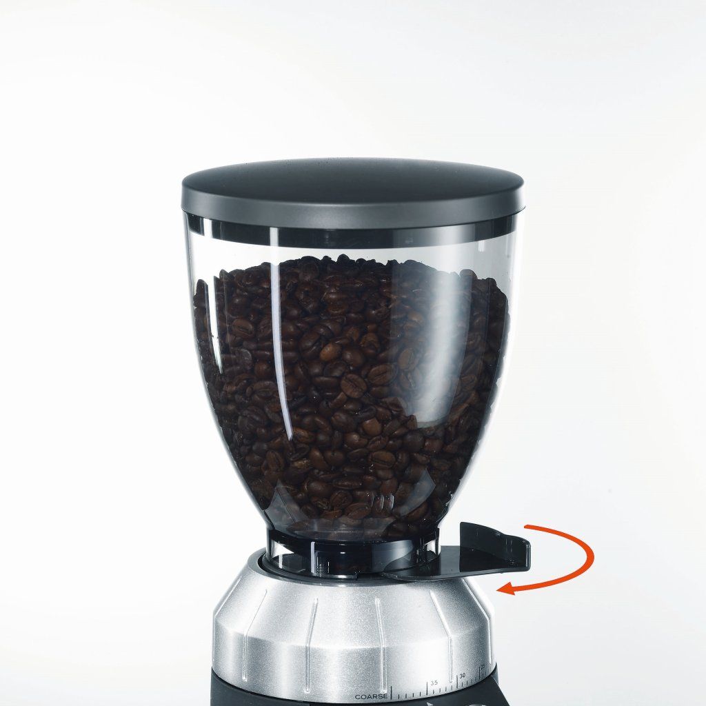 - Großer Trichter für 350 g Kaffeebohnen mit Deckel und 90°-Schnellverschluss