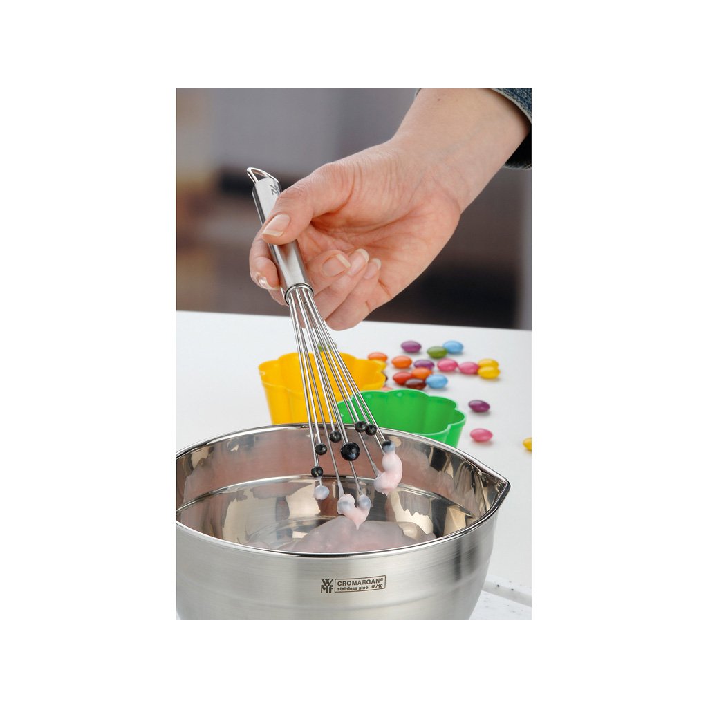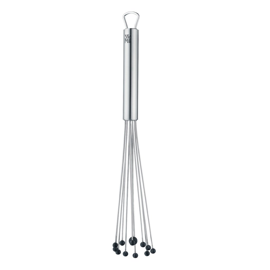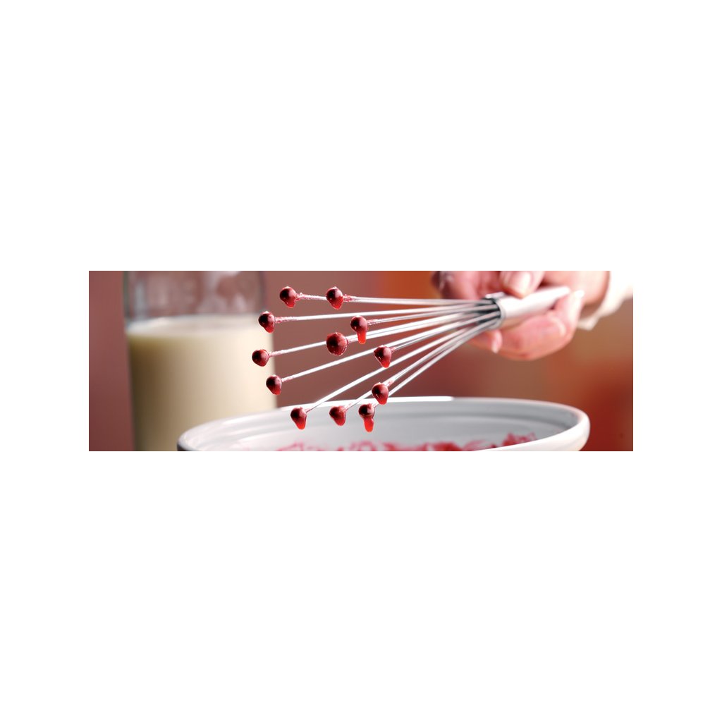 Der Schneebesen mit Silikonkugeln 27 cm Profi Plus ist eine Neuheit unter den Schneebesen. Es kann Temperaturen von bis zu 270 °C standhalten. Die vielen schwingenden Kugeln bringen viel Luft in die gerührte Masse, garantiert ohne "Klumpen". Dank der Eigenschwingung der Kugeln auf den Drähten ist die Suppe im Handumdrehen umgerührt und die Sahne in Sekundenschnelle abgewischt. Die Drähte reichen bis an den unteren Rand des Topfes oder der Schüssel, und dank des großen Greifbereichs bleibt nichts am Boden liegen. Zwischen den Drähten bleibt nichts "hängen", so dass der Besen leicht und schnell zu reinigen ist und die Hygiene gewährleistet ist.