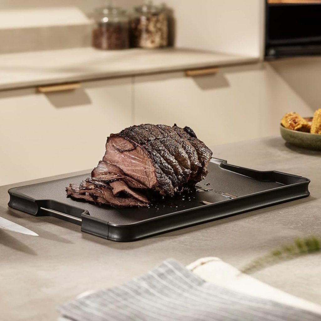 - erhöhte Ränder helfen, Krümel und Fleischsaft aufzufangen