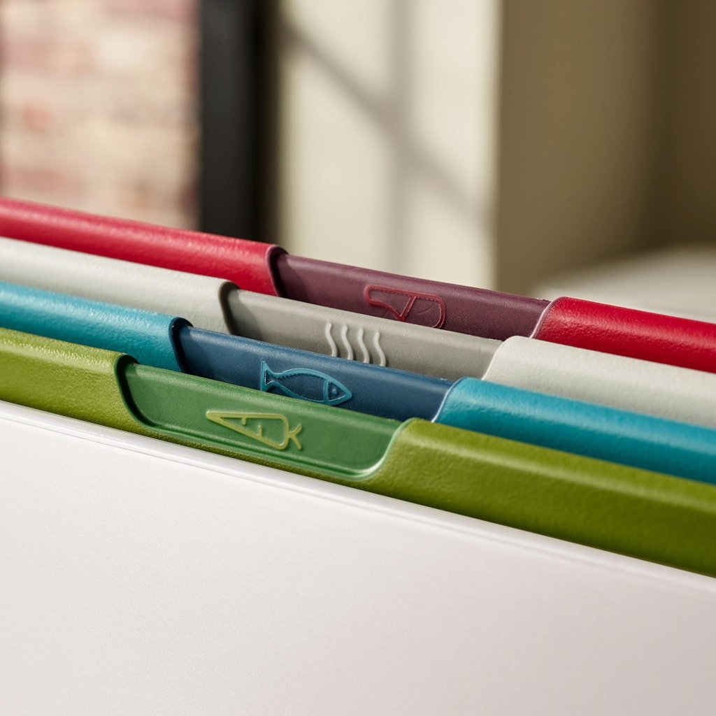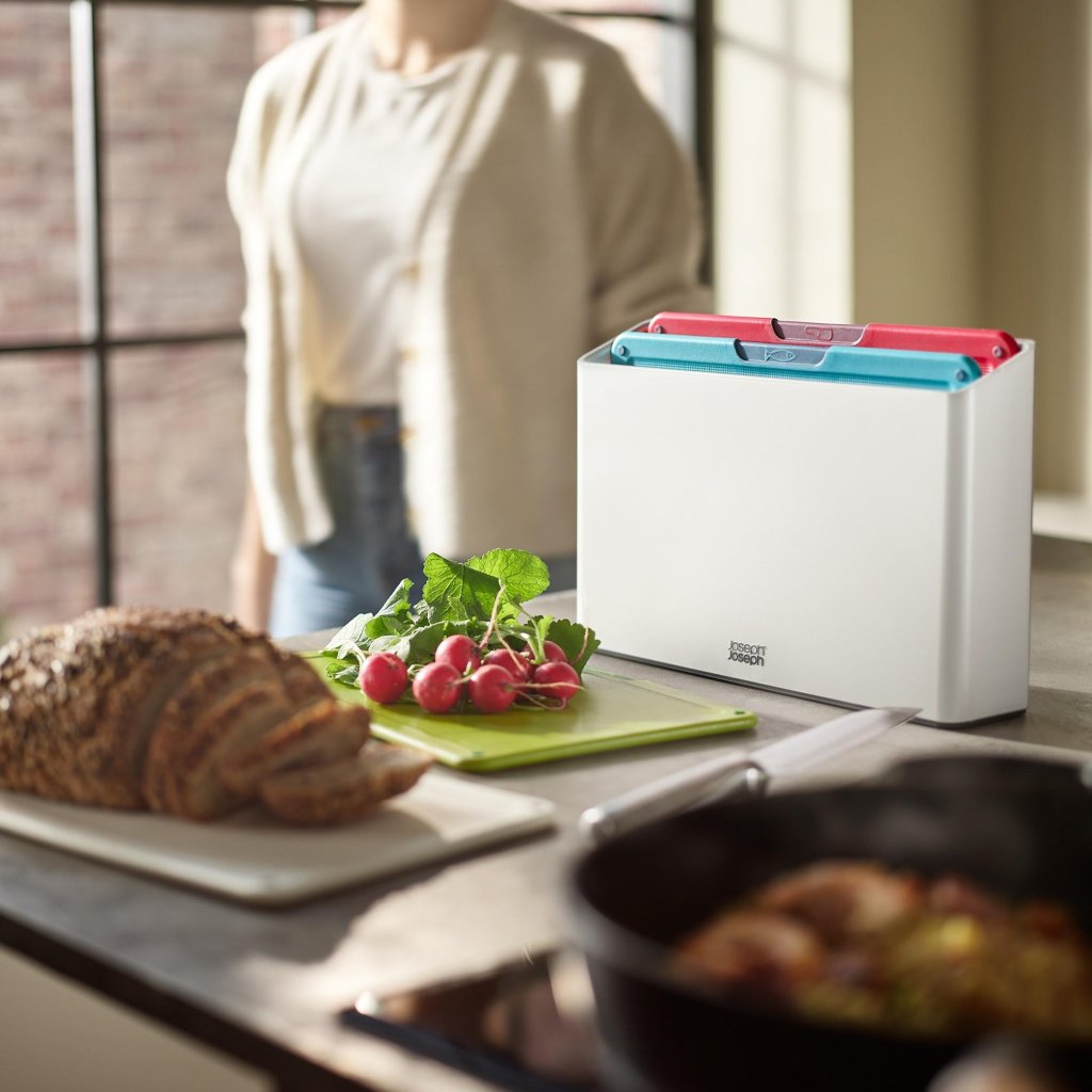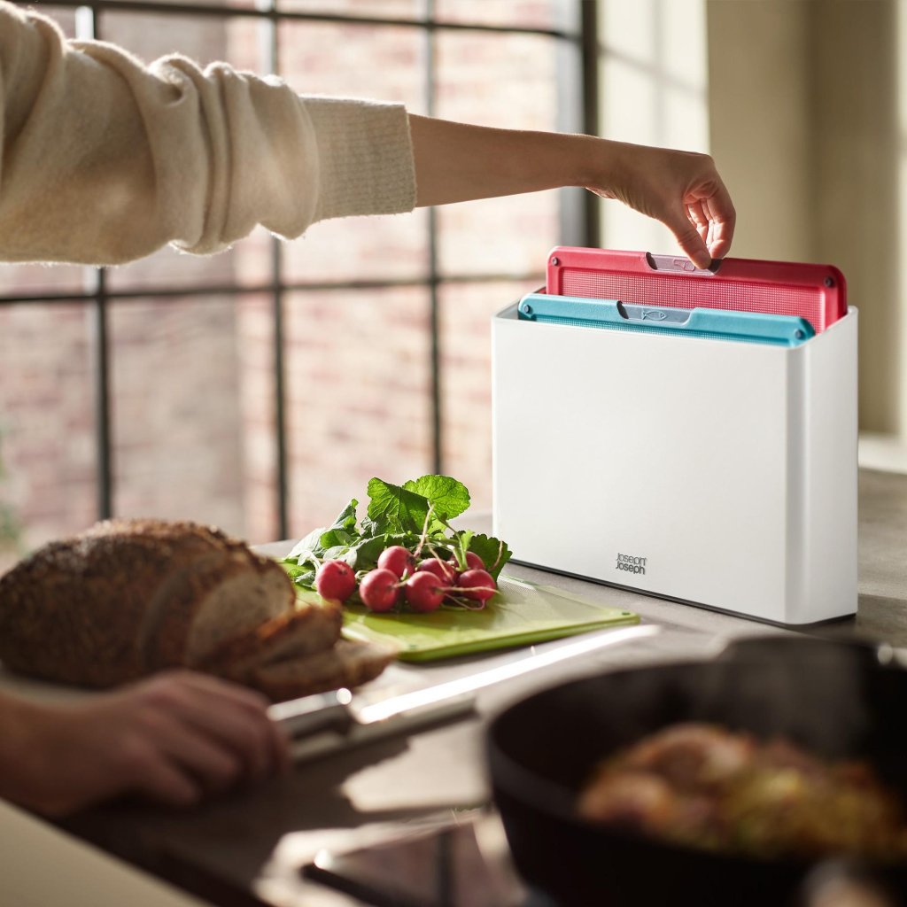 - Das Joseph Joseph FOLIO ICON Schneidebrett-Set enthält 4 praktische Bretter, die in einem kompakten Ständer aufbewahrt werden und helfen, die Arbeitsplatte bei der täglichen Essenszubereitung übersichtlich zu halten.