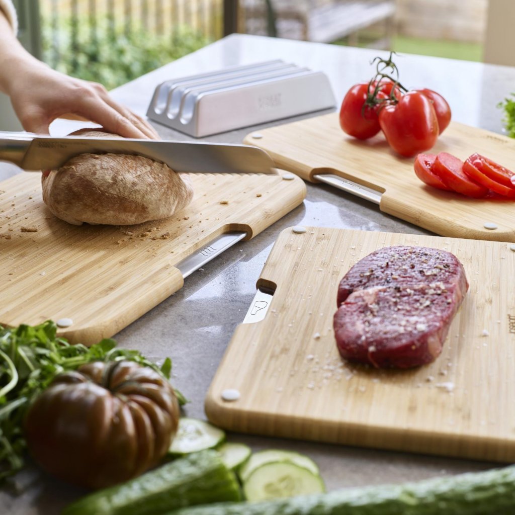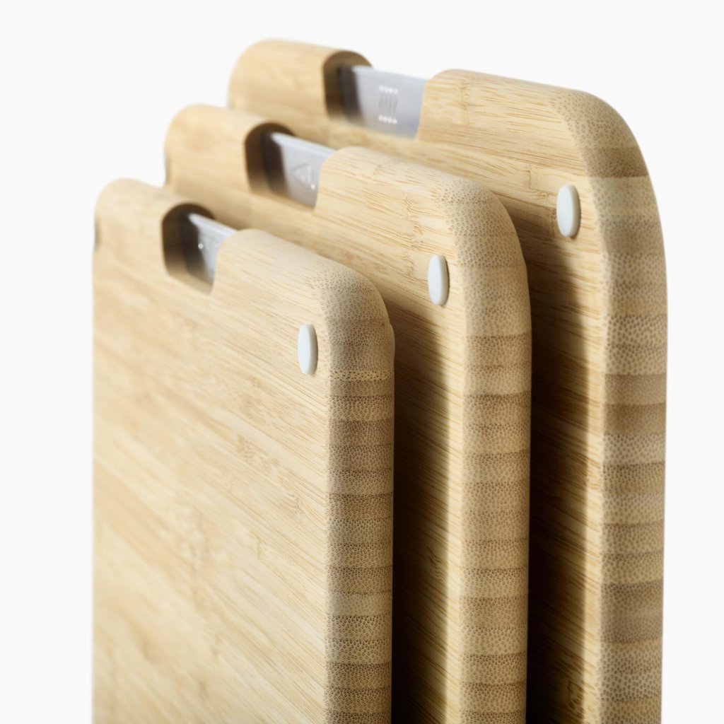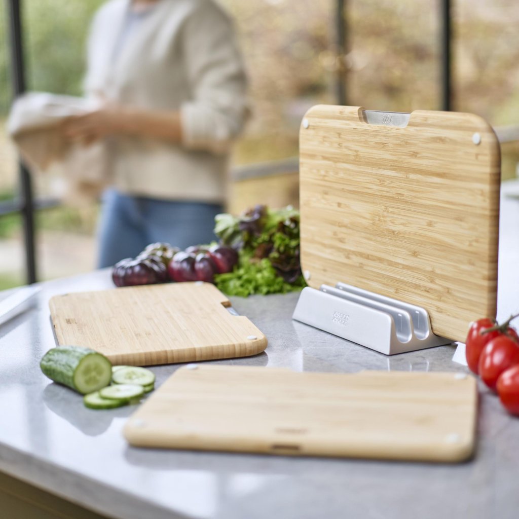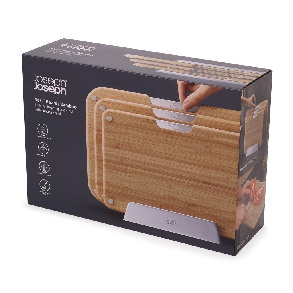 - Die NEST Schneidebretter-Serie von Joseph Joseph enthält 3 Bambusschneidebretter, die in einem kompakten Metallständer aufbewahrt werden, der die Arbeitsplatte während der Zubereitung von Speisen übersichtlich hält.