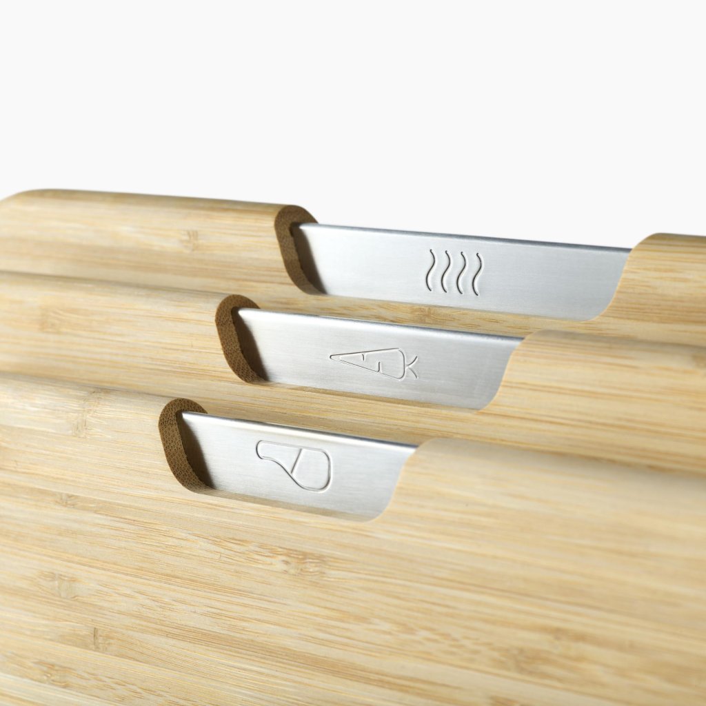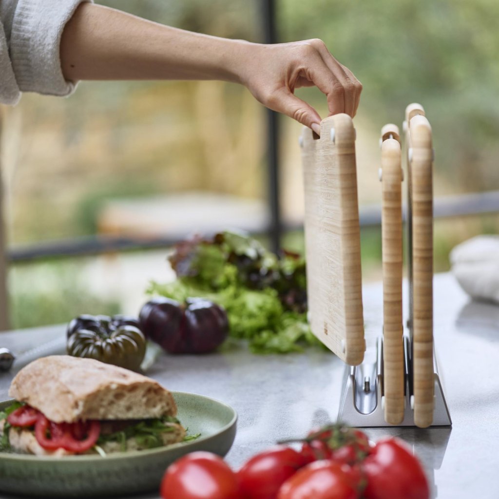 - Edelstahlgriffe an der Oberseite der Schneidebretter ermöglichen ein schnelles und bequemes Herausziehen aus dem Ständer während der Essenszubereitung.