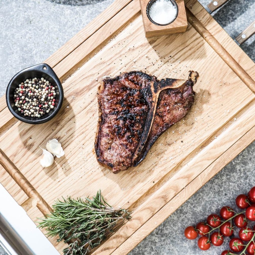 • doppelseitiges Schneidebrett - eine Seite ist glatt, die andere Seite hat eine Rille zum Abtropfen der Säfte von geschnittenen Lebensmitteln