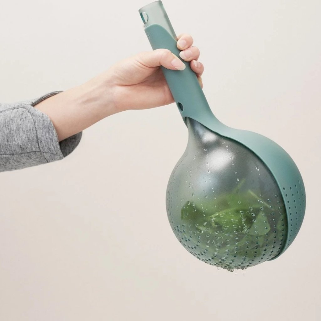 - Dank der Öffnung im Griff kann Seiher direkt am Wasserhahn befestigt und der Inhalt einfach mit einem Wasserstrahl abgewaschen werden