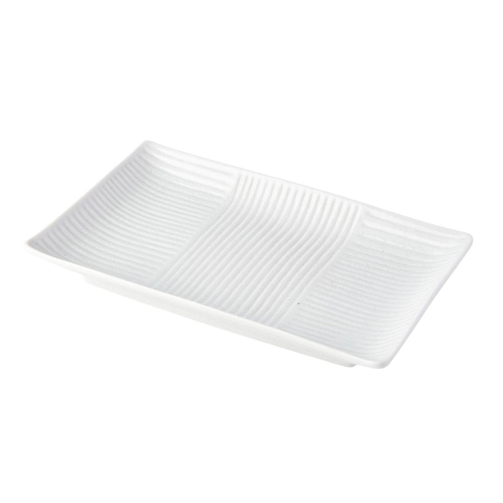 - Der rechteckige Teller LINES WHITE mit den Maßen 21 × 13 cm bietet ein sauberes und modernes Servieren von Sushi, Sashimi oder kleinen Tapas und wirkt dank seiner Schlichtheit ordentlich und elegant.