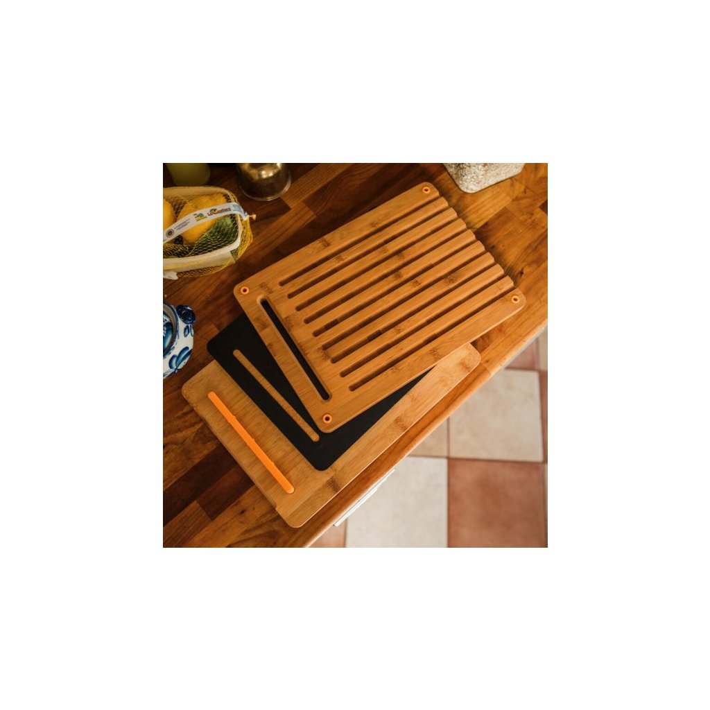 Die Schneidebretter und die Kunststoffplatte sind stapelbar und leicht zu verstauen. Die Rillen im Schneidebrett machen die Reinigung einfach. Das Schneidebrett hat rutschfeste Silikonfüße , um einen stabilen Stand beim Schneiden von Brot und Gebäck zu gewährleisten.