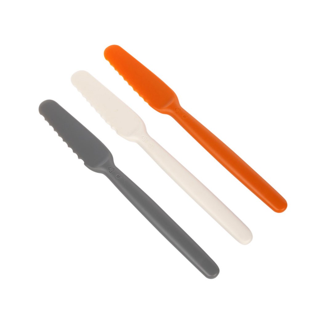 Set besteht aus 3 Kunststoffmessern mit gezackter Klinge. Sie sind ideal zum Schneiden von Lebensmitteln mit einer Kruste oder Haut (wie Brot oder Tomaten) und zum Streichen von Produkten (wie Butter). Sie sind auch als Ess- oder Steakmesser geeignet.
