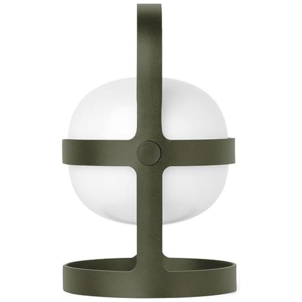Der Lampenschirm wird von einem patinierten Metallrahmen geschützt, der als Ständer und Griff dient. Die Solarleuchte ist in verschiedenen Farbtönen - hier in tiefem Grün - und drei Größen erhältlich, wobei diese mit einer Höhe von 34 cm die größte ist.