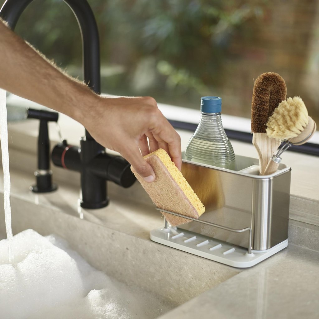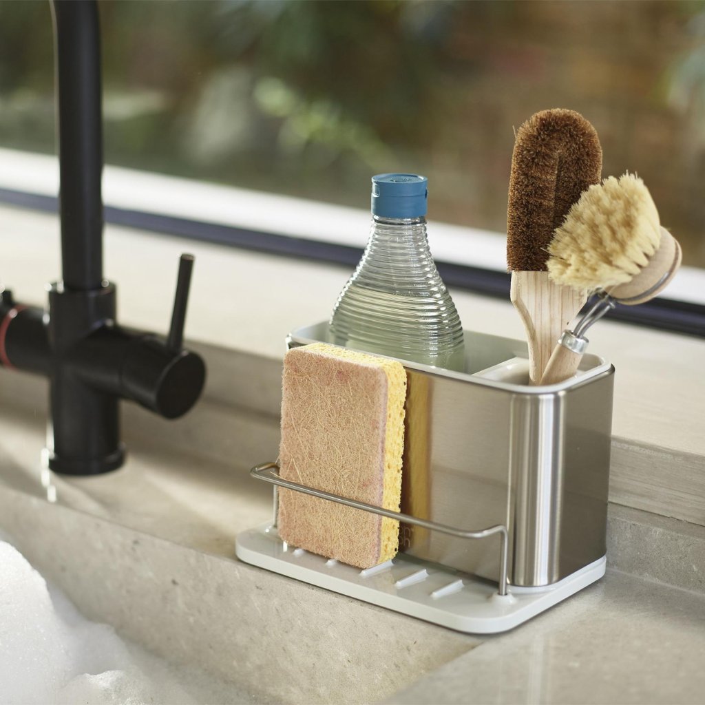Es gibt Zeiten, in denen man sich am Spülbecken wie in einem kleinen Labor voller Schwämme, Bürsten und Flaschen fühlt, die sich gegenseitig im Weg stehen. Dieser Organizer aus Edelstahl verleiht ihnen klare Ordnung und trennt die einzelnen Hilfsmittel so, dass jedes seinen Platz hat. Anstelle von Improvisation gibt es ein einfaches System, das jeden Tag funktioniert.