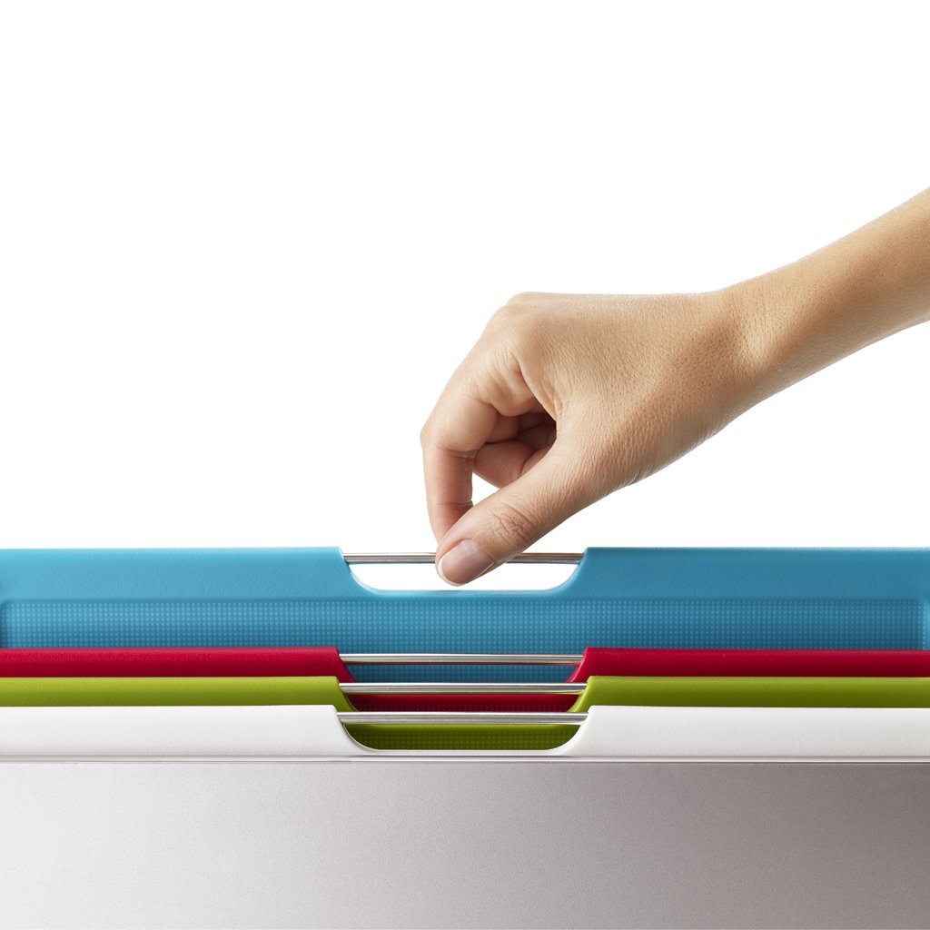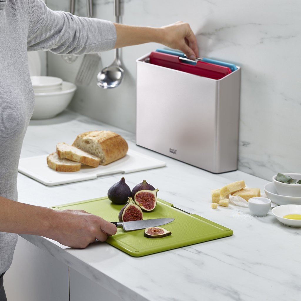 Die Stärken von Kunststoff-Schneidebrettern liegen eindeutig in der einfachen Pflege, der Hygiene und vor allem in der Tatsache, dass sie empfindlich gegenüber unseren Messern sind. Das Ziel der Designer von Joseph Joseph war es diesmal, die Schneidebretter auf der Arbeitsplatte zur Hand zu geben, einzigartige Schneidebretter zu produzieren, die den Zweck 100%ig erfüllen, und auch ihre elegante Lagerung zu lösen. Der Folio Schneidebrettständer ist ein Set für die häufigsten Küchenarbeiten.