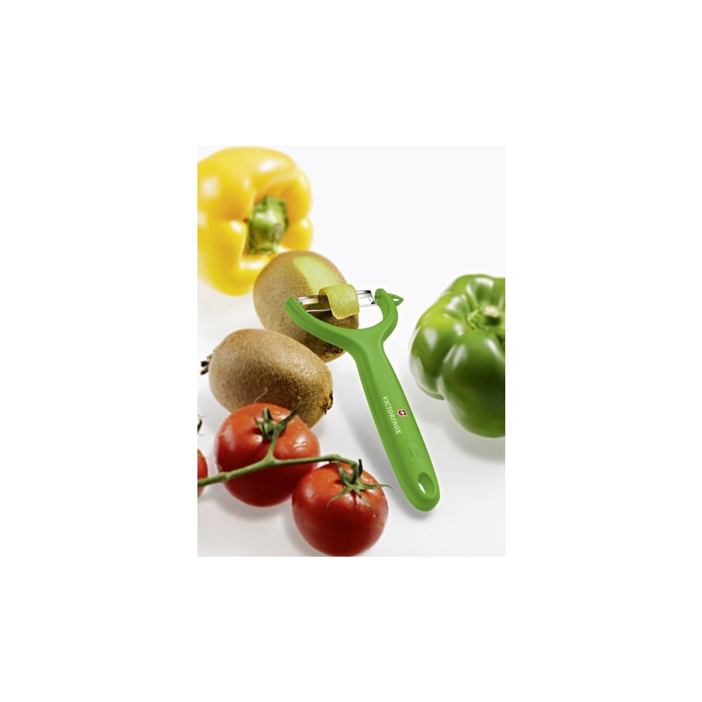 Rotierender Edelstahlschäler mit Mikroverzahnung und Doppelklinge ist geeignet für Tomaten oder Kiwis. Der ergonomische Griff aus grünem Kunststoff ermöglicht ein bequemes Arbeiten mit dem Schaber. Die Victorinox Küchenhelfer sind unverzichtbar für die tägliche Küchenarbeit!