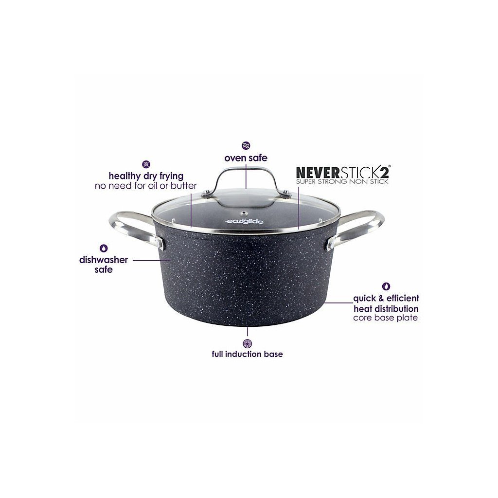 Neverstick2 Kochgeschirr repräsentiert die neueste Technologie und revolutionäre Innovationen im Bereich des antihaftbeschichteten Kochgeschirrs. Eaziglide Neverstick2, aus gehärtetem Aluminium wurde speziell entwickelt, um Ihnen das Leben zu erleichtern. die exklusive Neverstick2-Oberfläche hält viel länger als andere Oberflächen, verwendet eine 7x stärkere Technologie und ermöglicht Ihnen gesundes Kochen ohne Öl oder andere Fette.