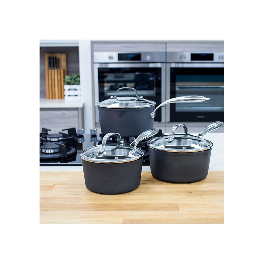 Die Eaziglide Neverstick3 Professional Kochgeschirr-Kollektion umfasst das Beste aus der Linie. Es ist aus eloxiertem Flugzeugaluminium für intensive Haltbarkeit hergestellt. Die neueste und verbesserte Antihaft-Kochgeschirroberfläche hält viel länger als andere Oberflächen. Es ist ideal für kulinarische Fachleute. Dieses hochwertige Kochgeschirr ist ideal für alle Herdarten, einschließlich Induktion, und kann auch zum Backen im Backofen bis 260 °C verwendet werden und ist spülmaschinenfest. Mit diesem Kochgeschirr wird das Kochen gesünder, denn man kann ohne Öl oder andere Fettekochen.