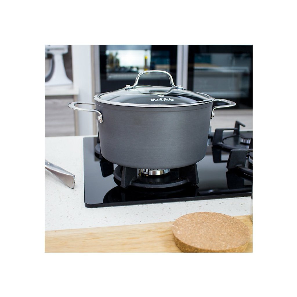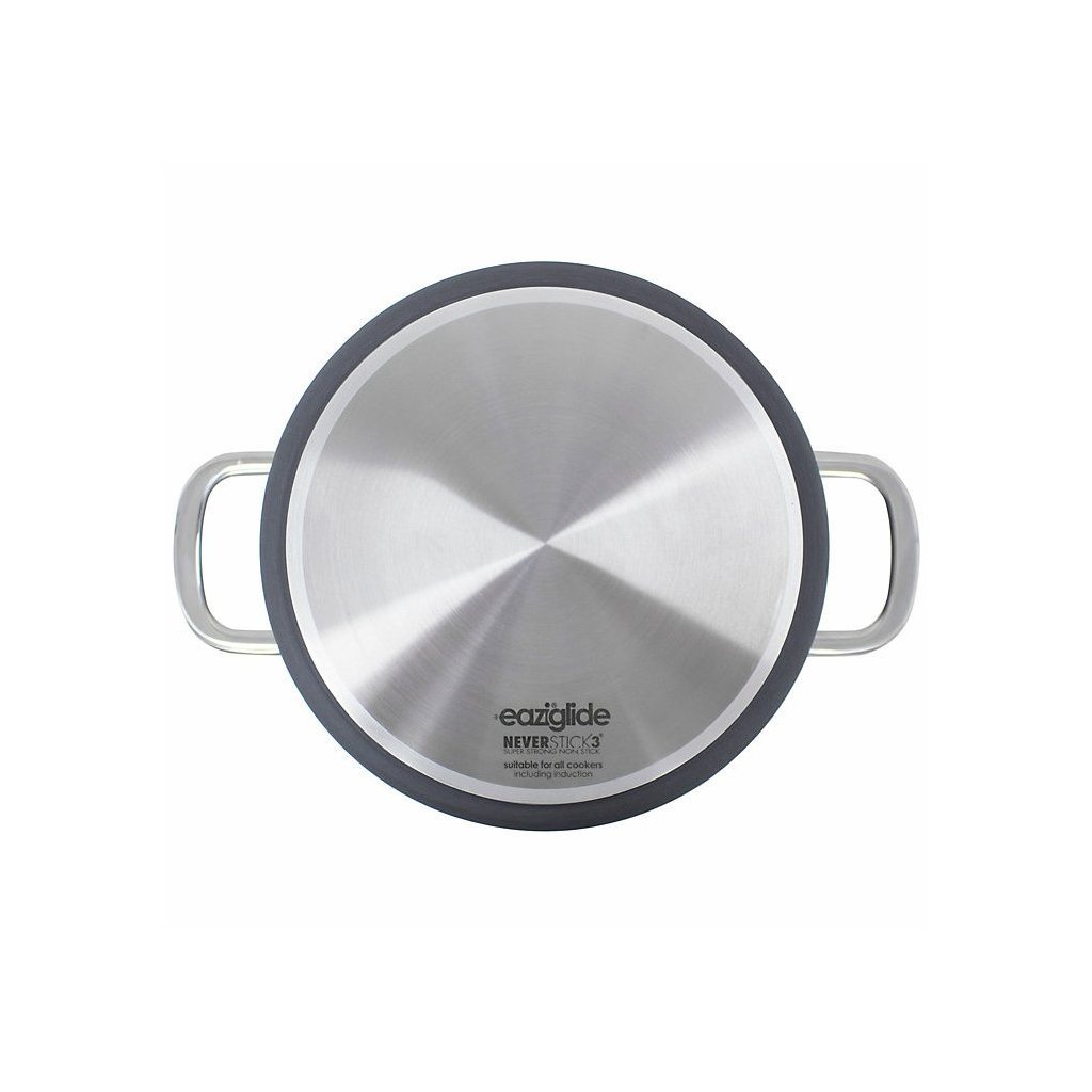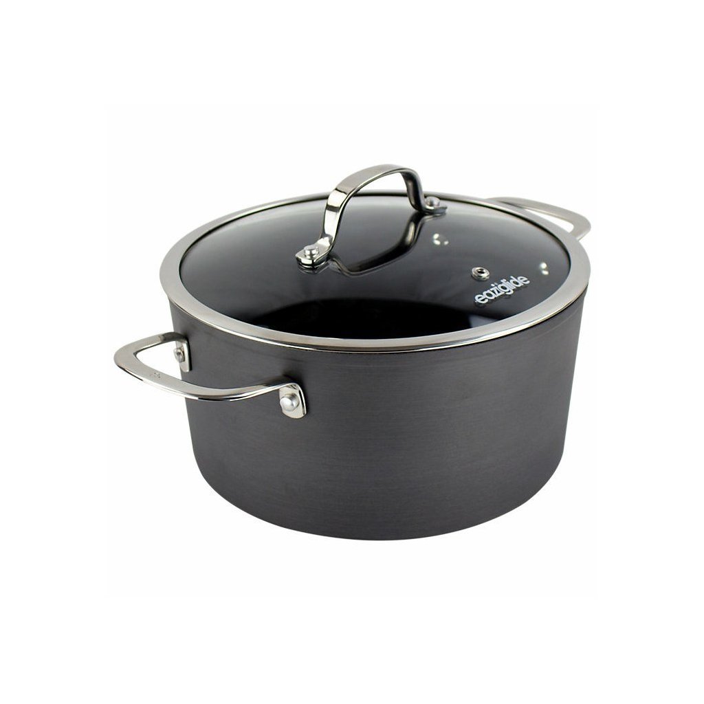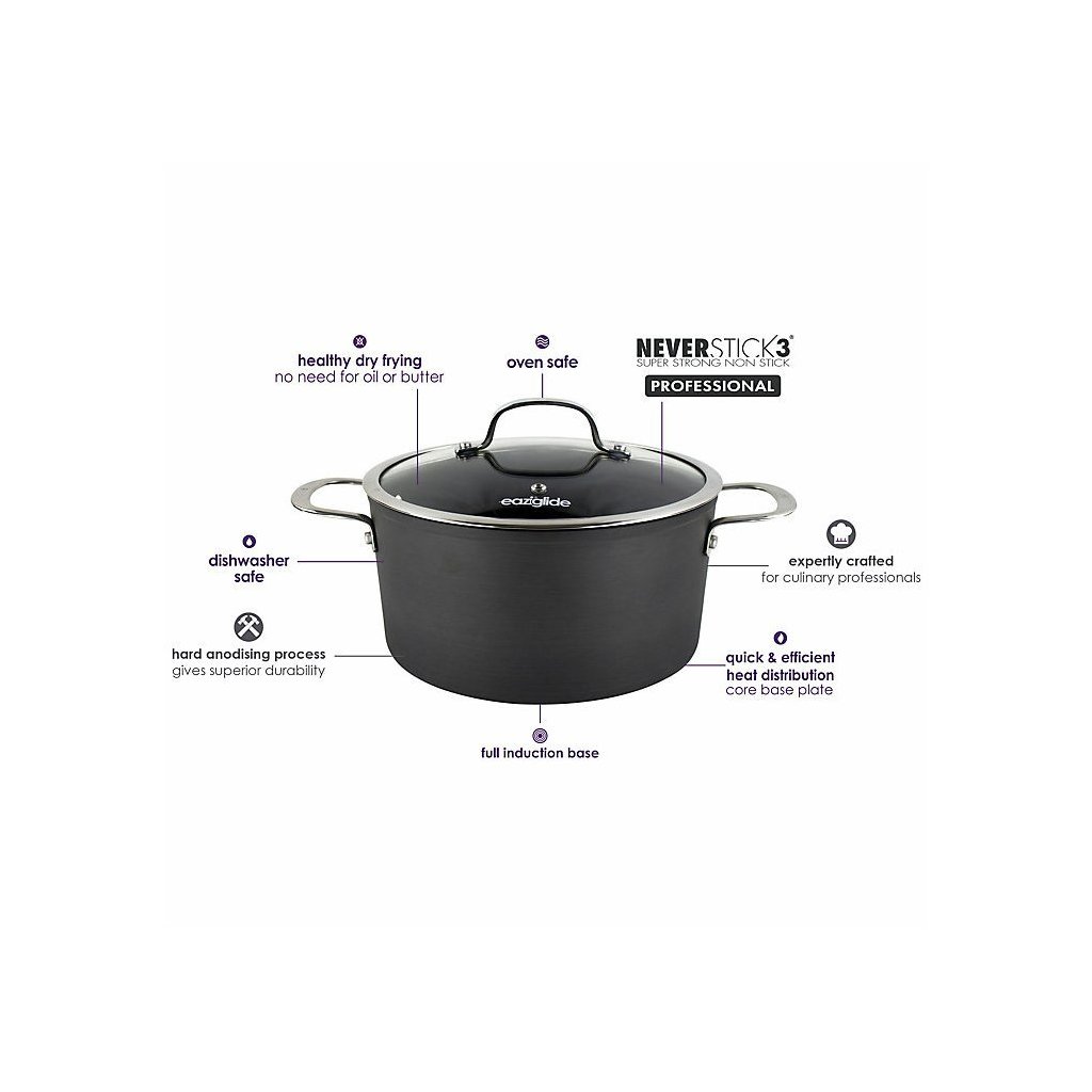 Die Eaziglide Neverstick3 Professional Kochgeschirr-Kollektion umfasst das Beste aus der Linie. Es ist aus eloxiertem Flugzeugaluminium für intensive Haltbarkeit hergestellt. Die neueste und verbesserte Antihaft-Kochgeschirroberfläche hält viel länger als andere Oberflächen. Es ist ideal für kulinarische Fachleute. Dieses hochwertige Kochgeschirr ist ideal für alle Herdarten, einschließlich Induktion, und kann auch zum Backen im Backofen bis 260 °C verwendet werden und ist spülmaschinenfest. Mit diesem Kochgeschirr wird das Kochen gesünder, denn man kann ohne Öl oder andere Fettekochen.