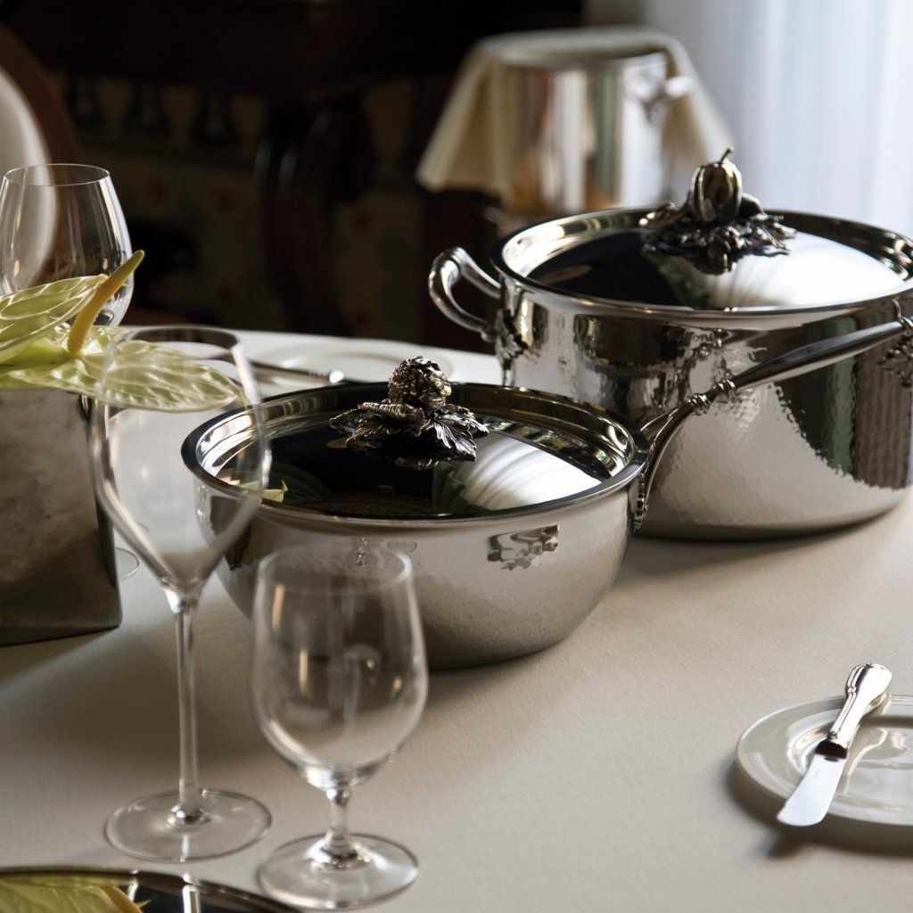 - luxuriöse, schmiedeeiserne, niedrige Kasserolle aus Edelstahl mit Deckel für die anspruchsvollsten Profi- und Hobbyköche