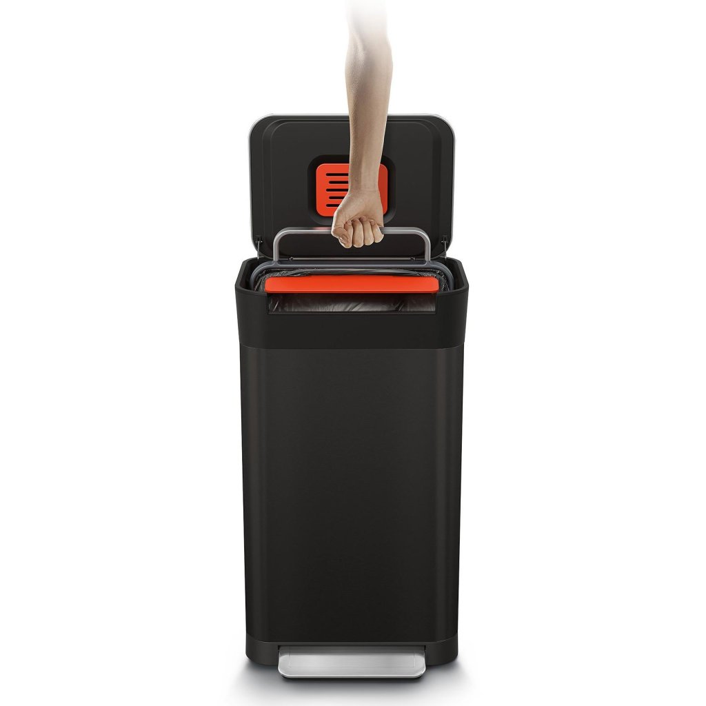 - Der integrierte Kompressionsmechanismus ermöglicht es, den Abfall direkt im Eimer zu verdichten, sodass er bis zu 3x mehr Abfall aufnehmen kann als herkömmliche Eimer ähnlicher Größe.