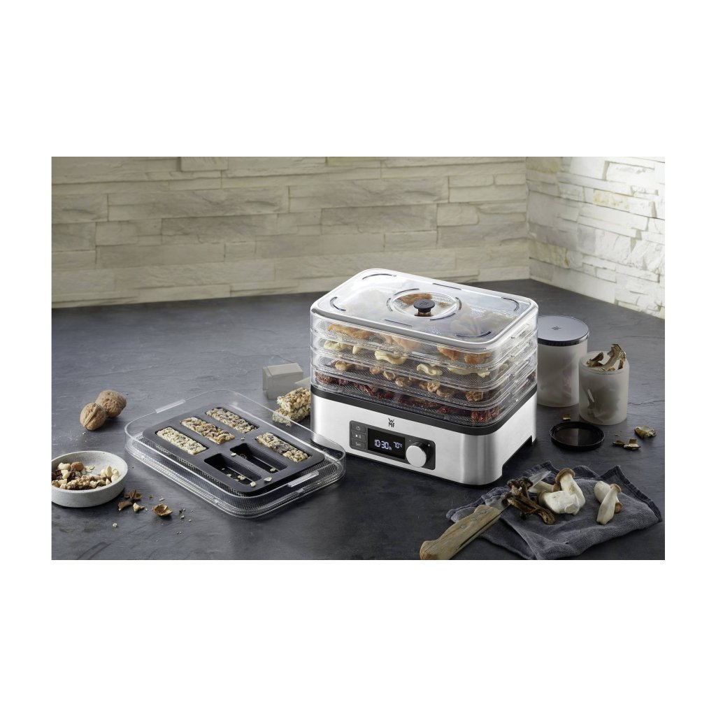 Mit dem Trockner aus der Kleingeräteserie KITCHENminis® der deutschen Marke WMF lassen sich Snacks und Trockenfrüchte ganz einfach zu Hause herstellen. 5 Etagen von Trockenblechen mit elektronischer Luftzirkulation trocknen effizient Fleisch, Obst, Gemüse, Pilze und Kräuter. Die Steuerung ist intuitiv. Das Gerät ist mit einer automatischen Abschaltfunktion ausgestattet, so dass Sie den Trockner über Nacht laufen lassen können. Zum Zubehör gehören auch eine Form für Obst- oder Müsliriegel und praktische Gläser für getrocknete Lebensmittel, einschließlich einer praktischen Reisetasche für die Riegel.
