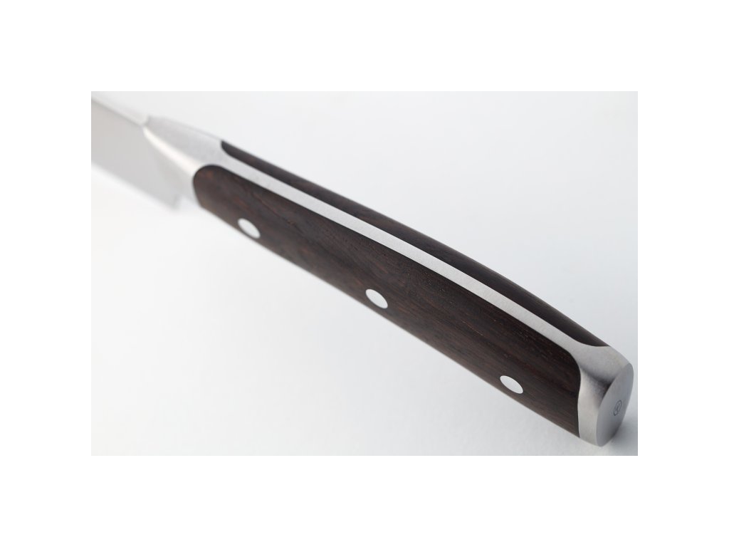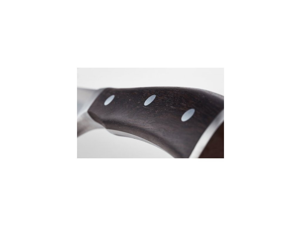 Der ergonomische Griff ist aus afrikanischem Grenadillholz gefertigt. Es ist ein sehr dauerhaftes, hartes Holz mit einer höheren Dichte als Ebenholz. Aufgrund seines hohen Harzanteils ist es relativ unempfindlich gegenüber Feuchtigkeit, eignet sich aber nicht für die Reinigung in der Spülmaschine. Die Holzklingen der Ikon-Messer sind mit drei Nieten fest mit dem Schaft verbunden. Die perfekte Verklebung der einzelnen Teile verhindert das Festsetzen von Ablagerungen und Bakterien.