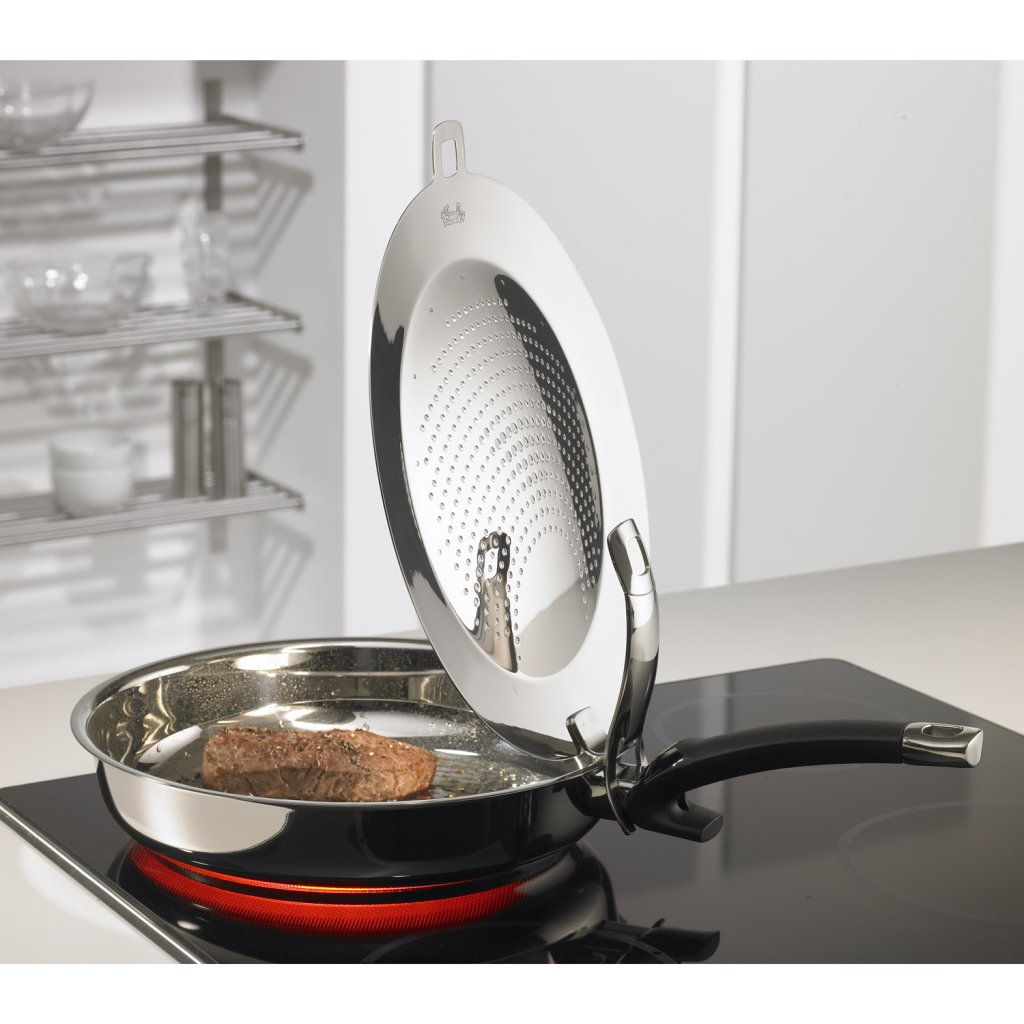 Frittierte Speisen werden oft von dem unerwünschten Brutzeln des Öls begleitet. Schützen Sie sich und Ihre Küche auf einfache Art und Weise. Aufklappbarer Schutzdeckel aus Edelstahl, der für Pfannen verwendet werden kann Fissler. Dank des Hakens haben Sie die Hände frei, um die Lebensmittel sicher zu handhaben. Der Deckel ist spülmaschinenfest.