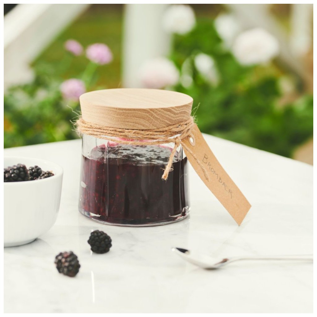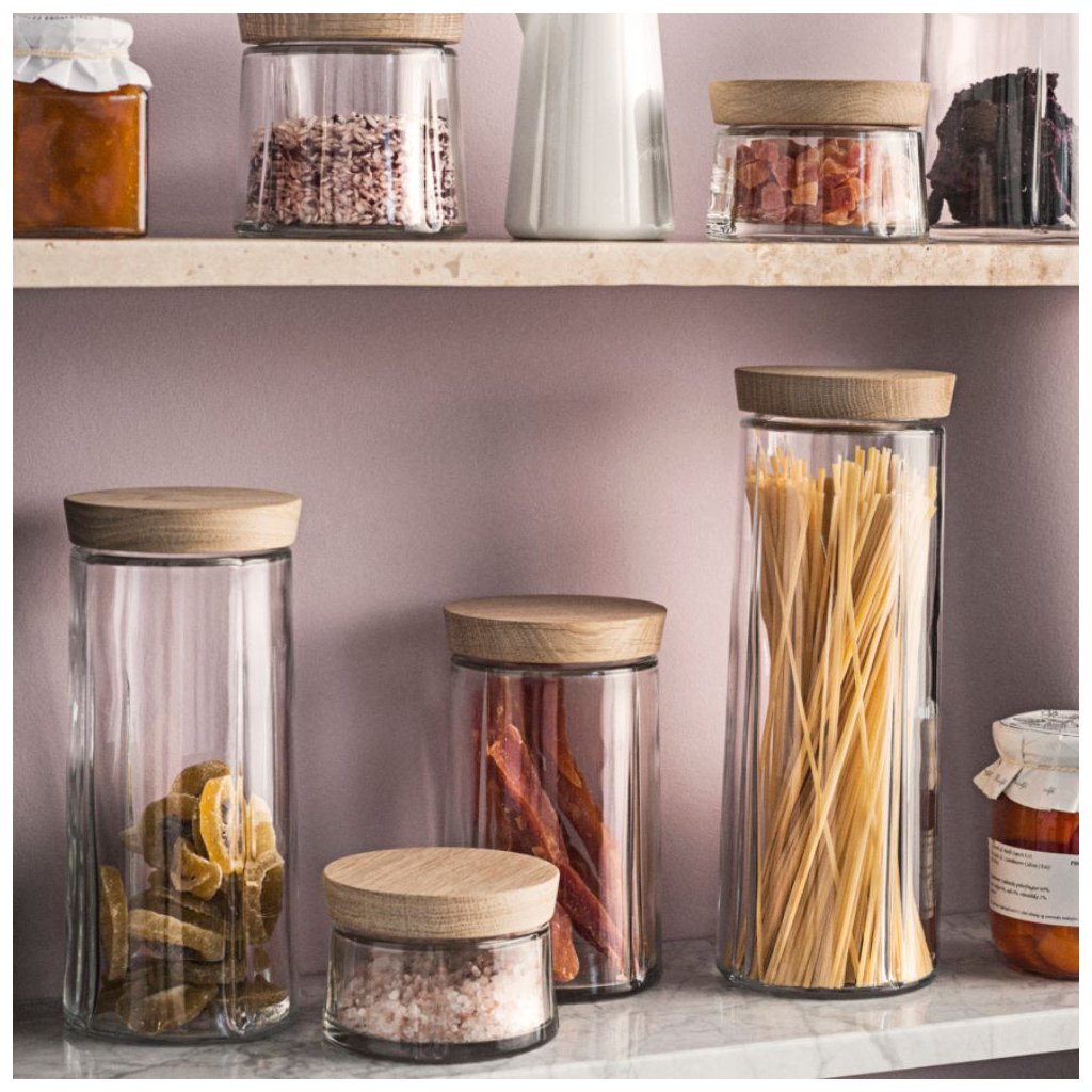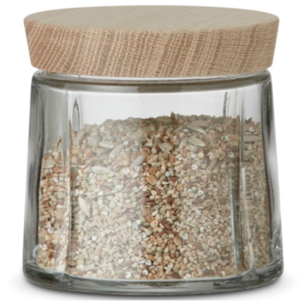 Diese kleine Vorratsdose ist aus bleifreiem, transparentem Glas mit einem fest sitzenden Deckel aus Eichenholz gefertigt. Sie ist mit den für die Kollektion typischen Rillen verziert und hat ein Volumen von 500 ml, deshalb ist sie perfekt für kleine Mengen von Nüssen, Rosinen, Tee, Zucker oder... Büroklammern.