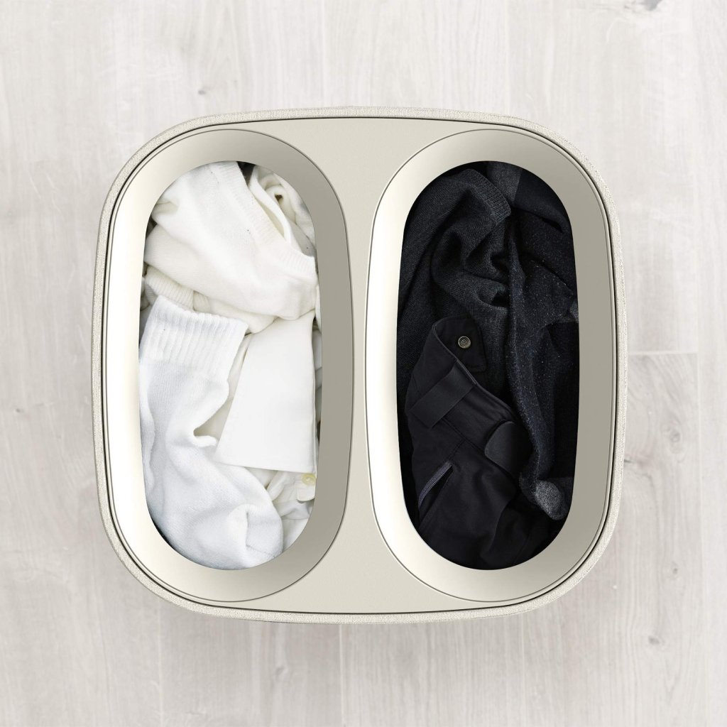 - Zwei separate 30-Liter-Fächer erleichtern die Trennung von heller, dunkler und bunter Wäsche während der Lagerung.