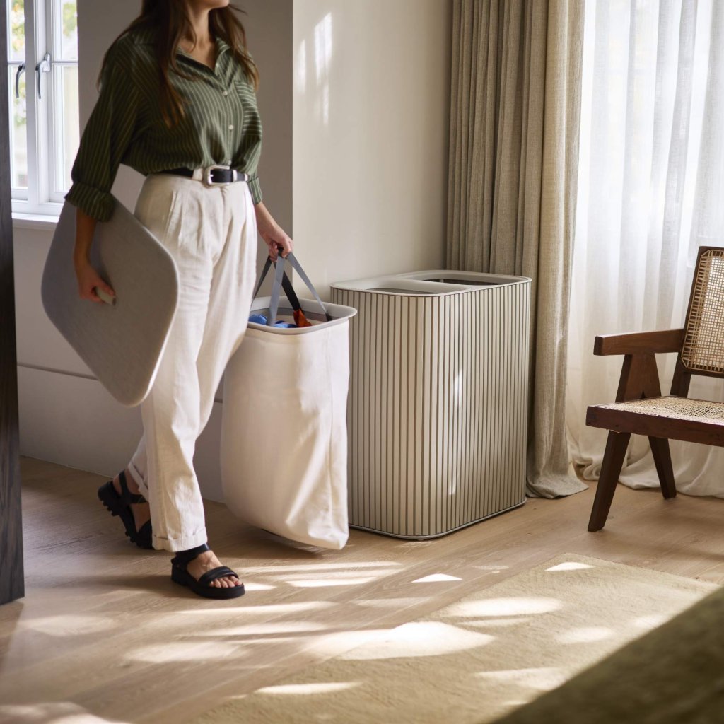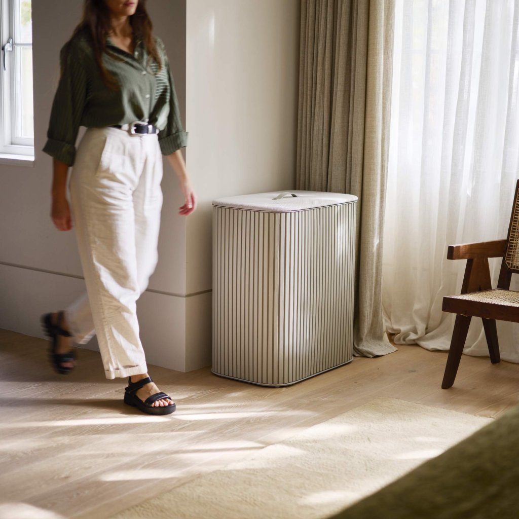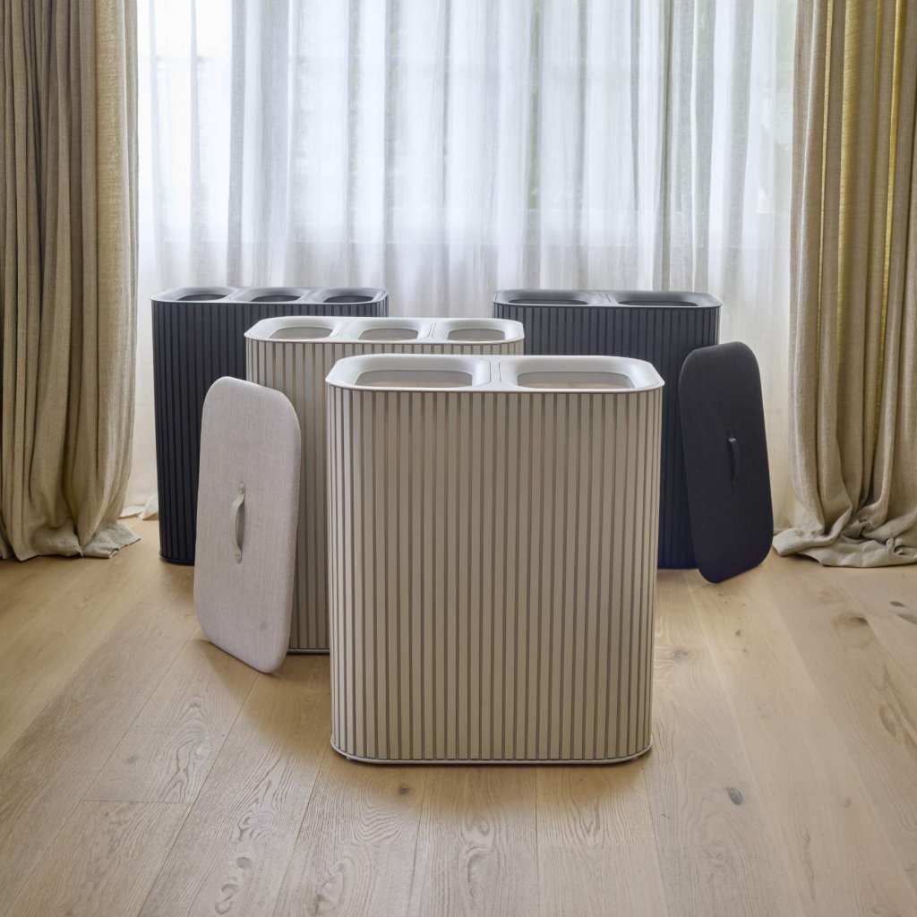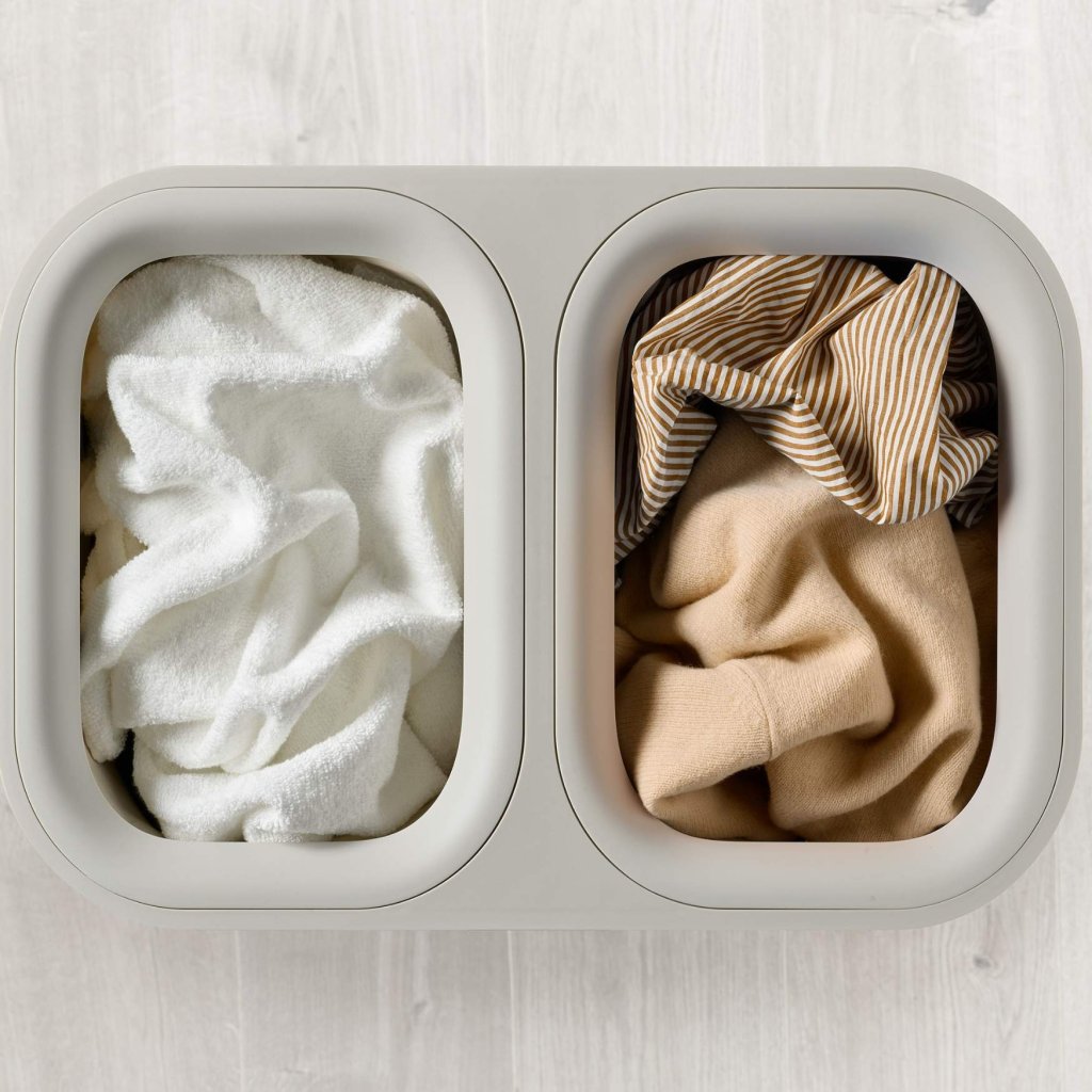 - Zwei getrennte 45-Liter-Fächer erleichtern die Trennung von heller, dunkler oder empfindlicher Wäsche, sobald sie weggelegt wird.