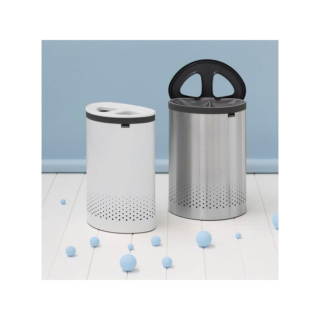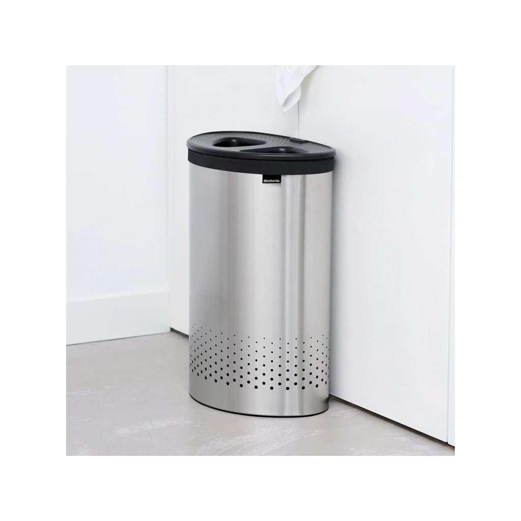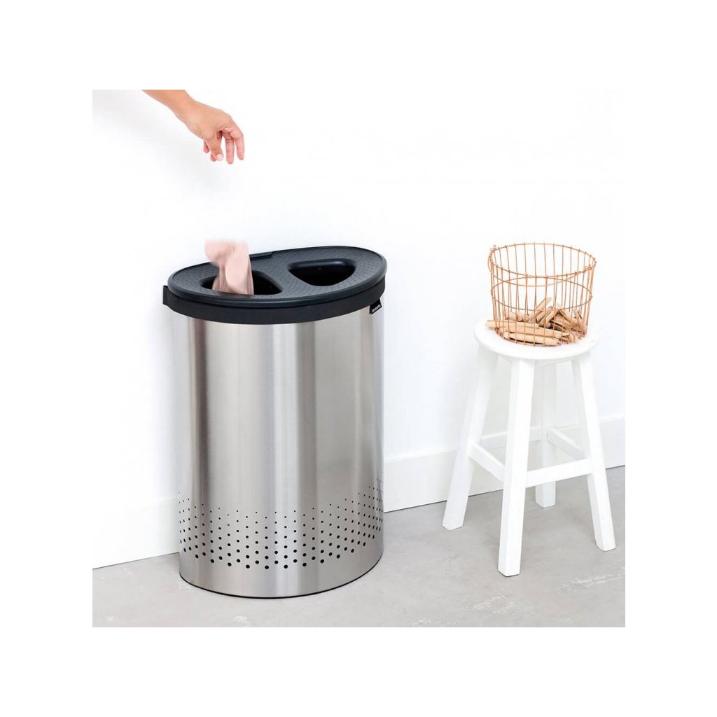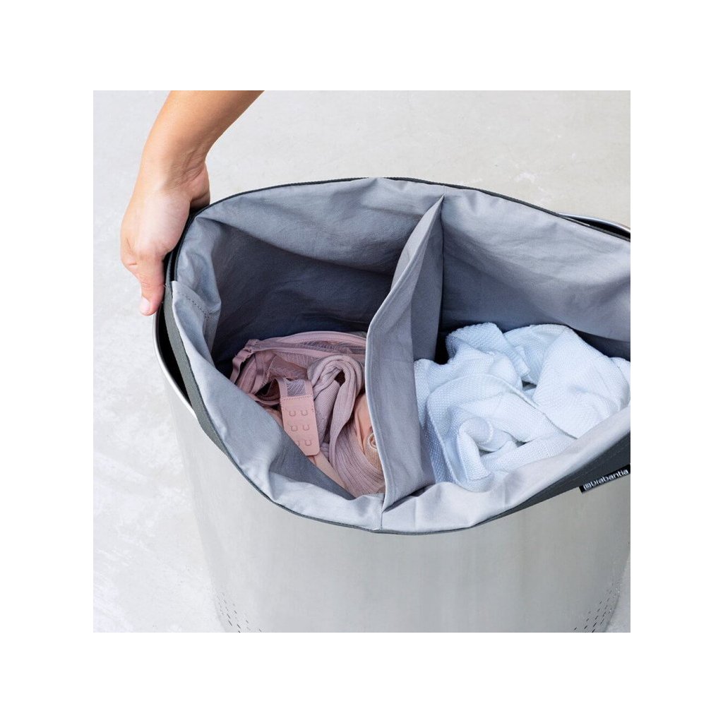 Der Brabantia Selector Wäschekorb bietet eine praktische Lösung zur Aufbewahrung von Schmutzwäsche für Ihre Wohnung oder Ihr Einfamilienhaus. Der Doppelloch-Deckel bietet eine clevere Quick-Drop-Öffnung, bei der der Deckel nicht mehr abgenommen oder entfernt werden muss. Kleinere Stücke können direkt durch den Deckel eingeführt werden, für größere öffnet man einfach den Deckel und sie bleiben am Rand des Korbes liegen. Im Inneren des Korbes befindet sich ein zweigeteilter Baumwollwäschesack mit Klettverschluss, an der Unterseite sorgt ein Schutzring für die richtige Stabilität.