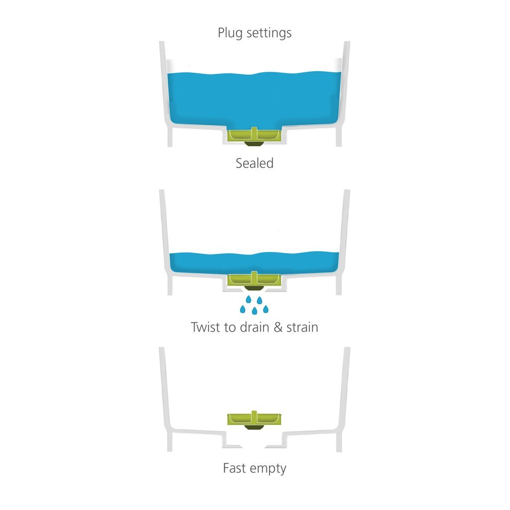 Waschbehälter mit Abflussdeckel JOSEPH JOSEPH Wash & Drain. Der von Morph entworfene Behälter hat einen eigenen Ablassstopfen, der ein einfaches Entleeren ermöglicht, ohne dass der gefüllte Behälter angehoben und gekippt werden muss. Die Kappe kann als Sieb eingesetzt werden, um zu verhindern, dass der Abfluss des Spülbeckens beim Entleeren verstopft. Der Behälter hat steile Seiten und große Griffe zum einfachen Tragen. Sie können es direkt in die Spüle geben oder es überall als normales Spülmittel verwenden.