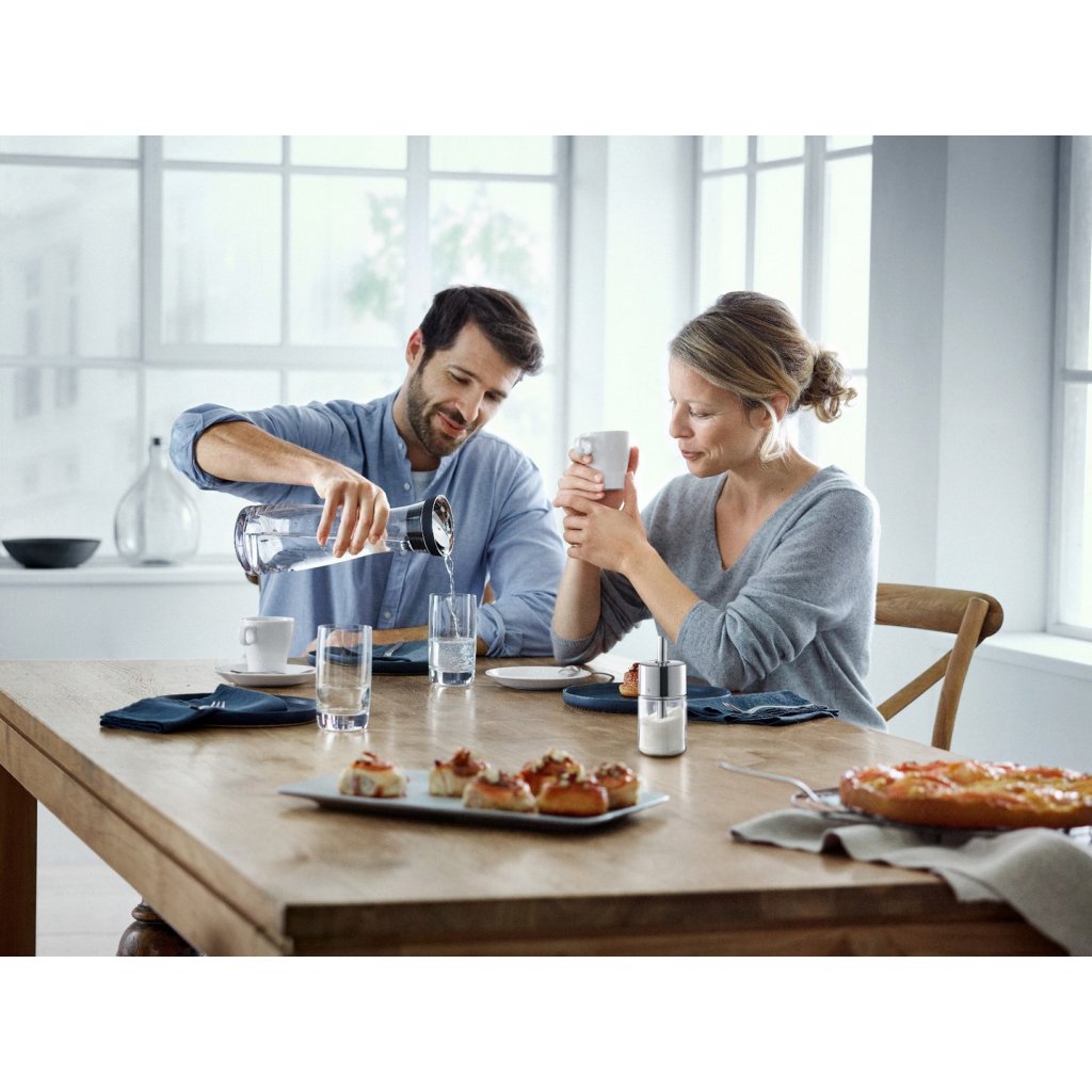 Nippen Sie gerade an einem Espresso oder bereiten Sie ein großartiges Festmahl für Ihre Lieben vor? Wasser ist die richtige Ergänzung zu beidem. WMF hat eine Wasserkaraffe für alle Gelegenheiten geschaffen. Sie entspricht allen Anforderungen, wenn man Wasser hygienisch servieren will, und das in einem sehr attraktiven Design. Der durchdachte Deckel verschließt die Karaffe nicht nur automatisch, sondern er hält dank des eingebauten Siebs auch Eiswürfel oder Fruchtstücke beim Ausgießen im Inneren. Die Karaffe kann in die Kühlschranktür gestellt werden.